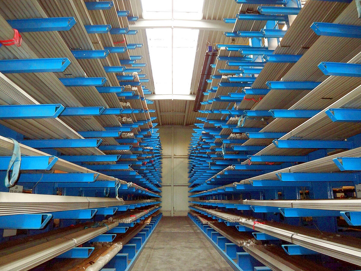 Die Lösung war ein Kragarmregal-System mit einer Höhe von 7,50 m und 14 Lagerebenen übereinander bei einer Tragfähigkeit von jeweils 1.200 kg pro Kragarm mit einer Länge von 1.250 mm.
