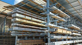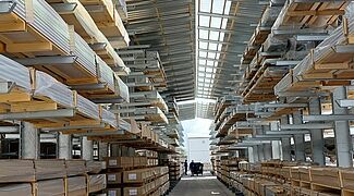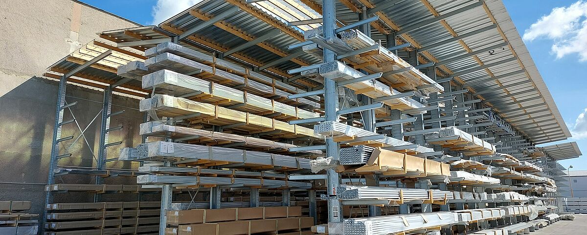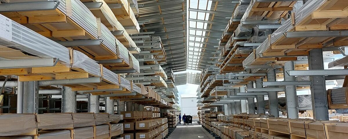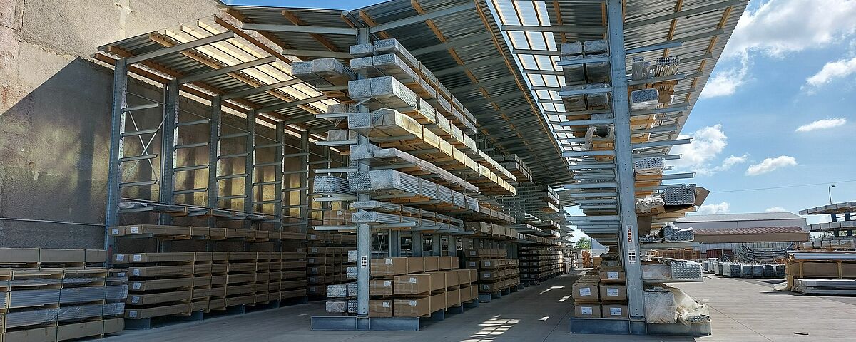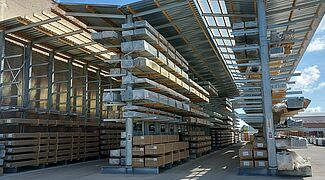 Eine auf die Anforderungen zugeschnittene Regallösung fand ALBIXON schließlich beim Hersteller OHRA: Drei Zeilen von 7.300 Millimeter hohen Kragarmregalen nutzen den zur Verfügung stehenden Platz bestmöglich aus. Die Traglast pro Kragarm beträgt 500 Kilogramm. Die Regalständer tragen zudem sich überlappende Dächer, die teilweise mit transparentem PVC gedeckt sind – das sorgt für eine gute Helligkeit auch im Bodenbereich.