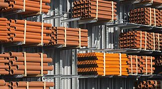 Auch das vorhandene Lager sollte optimiert werden: Es dient nicht nur der Versorgung der Kunden, sondern von hier aus werden auch die vier weiteren Niederlassungen mit Hölzern und Baustoffen beliefert. Im Rahmen der Umstrukturierung entschied Beinbrech sich, vorhandene Regalanlagen durch neue Kragarmregale zu ersetzen. Sie sind mit einer Ständer-Höhe von bis zu 6,58 Metern deutlich höher als die alten Regale und bieten damit mehr Platz. So lassen sich alle anfallenden Anbrüche schnell kommissionieren und auch große Mengen bevorraten.