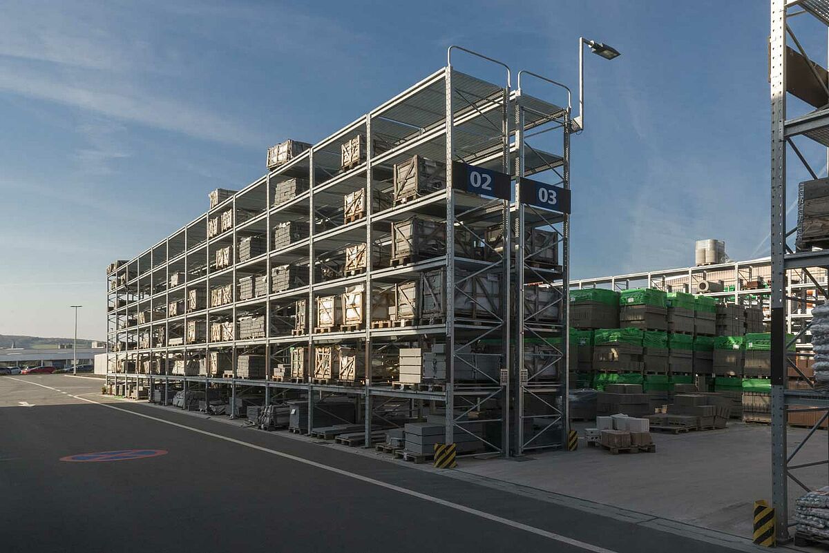 Insgesamt wurden in der Anlage 440 Meter Kragramregale und 970 Meter Palettenregale mit einer Gesamtlagerfläche in den Regalen von 13.400 qm errichtet. Die durchschnittliche Lagerhöhe betrug 7 Meter und die Regale wurden neben spezifischem Zubehör für den Baustoffhandel teilweise auch mit Dach realisiert.