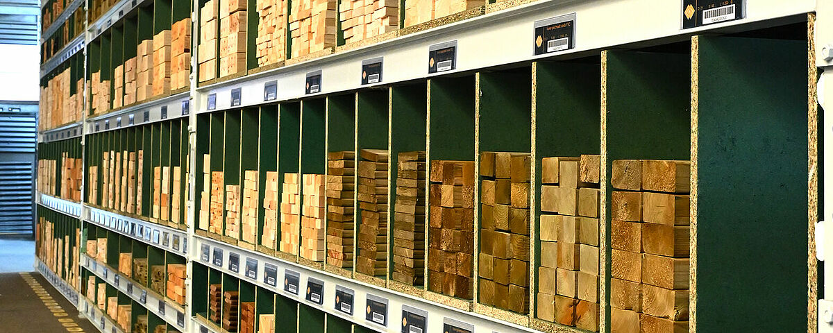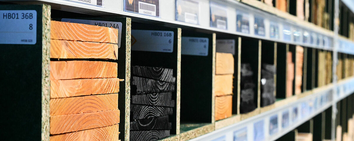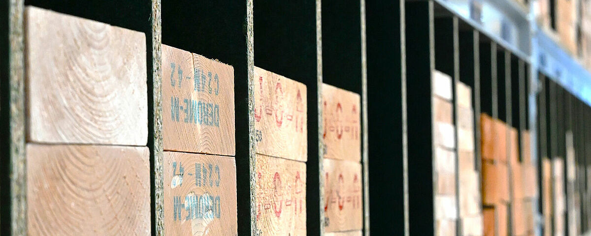 Um eine durchgängige Lagerfläche zu erhalten, montierte OHRA Spanplatten als Böden in die Lagerebenen. Sie werden durch 18 Millimeter starke Spanplatten unterteilt, die Brentjens selbst montiert hat. So entstehen unterschiedlich breite Fächer, in die sich Leisten und Latten einfach in Längsrichtung einschieben lassen. Jedes Fach wird mit nur einem Artikeltyp befüllt - so erkennt der Kunde direkt die verschiedenen Querschnitte und kann schnell auf die gewünschte Ware zugreifen. Die Oberseite des Regals wird zudem “klassisch” als Paletten- bzw. Fachbodenregal genutzt und bietet zusätzliche Lagerfläche für die unterschiedlichsten Materialien.