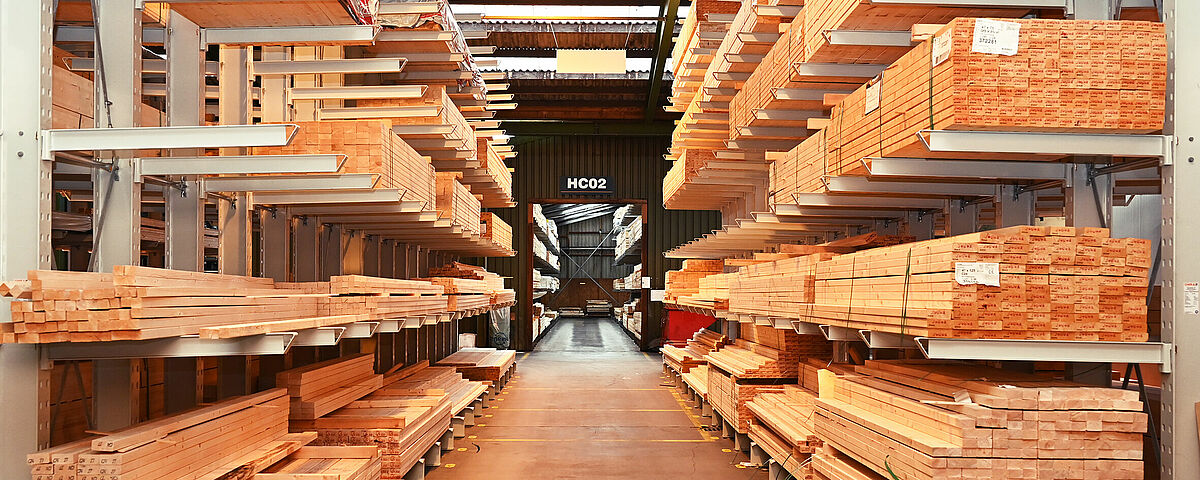 Um die Vielzahl der verschiedenen Leisten, Latten und Konstruktionshölzer für den Kunden gut übersichtlich zu lagern und zu präsentieren, ergänzte Brentjens die Kragarmregale durch ein 12 Meter breites “Einsteckregal”: Dabei handelt es sich um zwei hintereinander gestellte, knapp 2,6 Meter hohe Palettenregale. Deren beide jeweils 1 Meter tiefe Rahmen sind durch einen ebenfalls 1 Meter langen Abstandshalter solide miteinander verbunden. So entsteht ein Doppelregal mit einer Fachtiefe von 3 Metern.