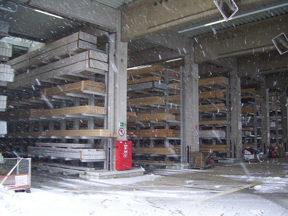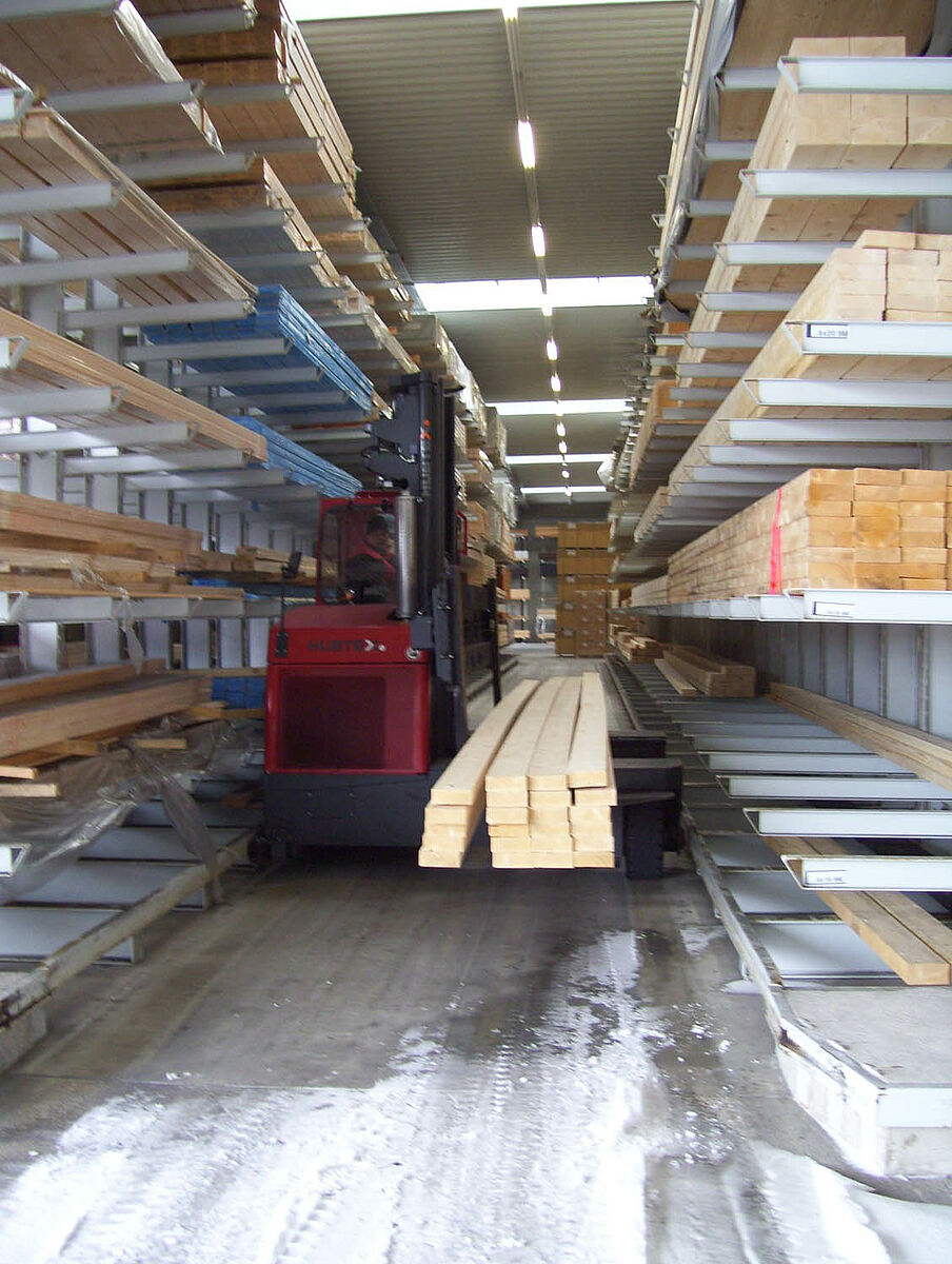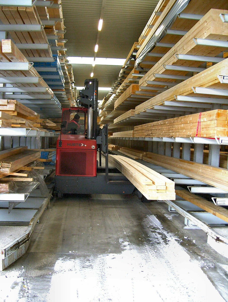 In nur zwei Wochen montierten die Fachleute aus Kerpen dann 236 Lagerplätze für Konstruktionsvollholz und Brettschichtholz in 40 und 50 Meter langen und 6,2 Meter hohen Kragarm-Regalreihen. Insgesamt sind so 2.800 laufende Meter Regalebenen für Langholz entstanden. Zusätzlich wurden 300 Stellplätze in Paletten- und Kragarmregalen realisiert, in denen Palettenwaren und das Grundsortiment gelagert werden. Bedient wird das Lager von zwei Hubtex-Seitenstaplern und einem Linde-Frontstapler. Alleine in den ersten sechs Monaten nach der Inbetriebnahme wurden bereits rund 3.300 Kubikmeter Holz umgeschlagen.