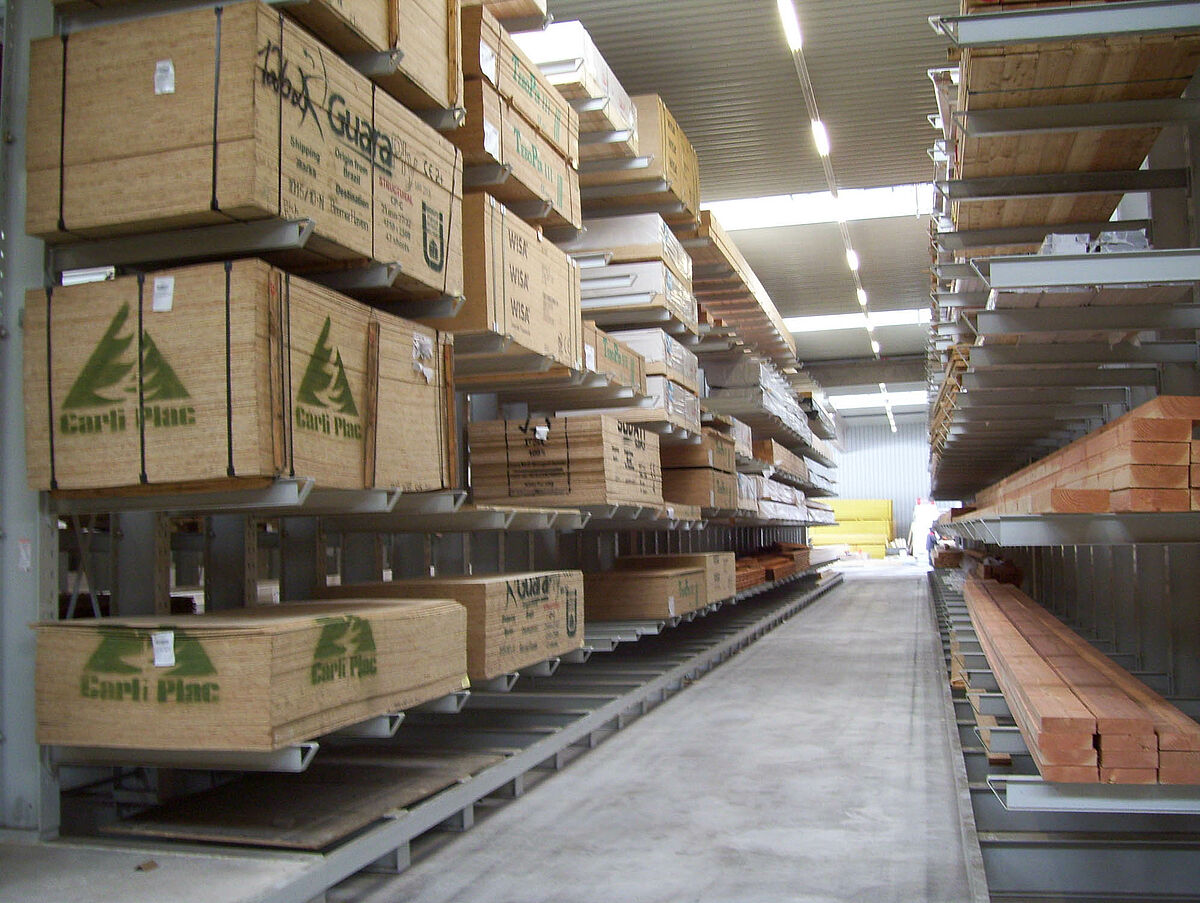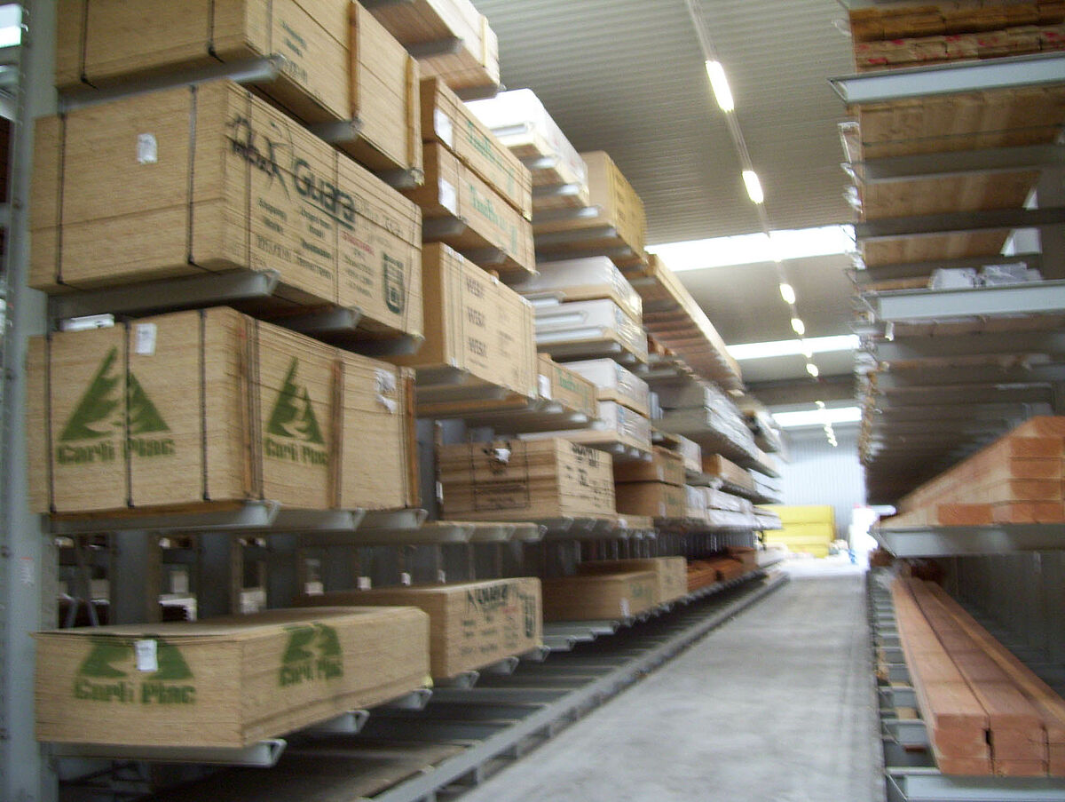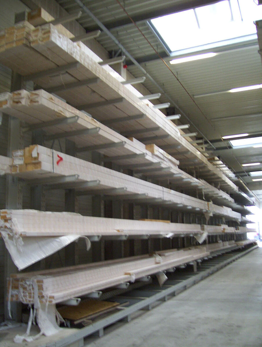In nur zwei Wochen montierten die Fachleute aus Kerpen dann 236 Lagerplätze für Konstruktionsvollholz und Brettschichtholz in 40 und 50 Meter langen und 6,2 Meter hohen Kragarm-Regalreihen. Insgesamt sind so 2.800 laufende Meter Regalebenen für Langholz entstanden. Zusätzlich wurden 300 Stellplätze in Paletten- und Kragarmregalen realisiert, in denen Palettenwaren und das Grundsortiment gelagert werden. Bedient wird das Lager von zwei Hubtex-Seitenstaplern und einem Linde-Frontstapler. Alleine in den ersten sechs Monaten nach der Inbetriebnahme wurden bereits rund 3.300 Kubikmeter Holz umgeschlagen.