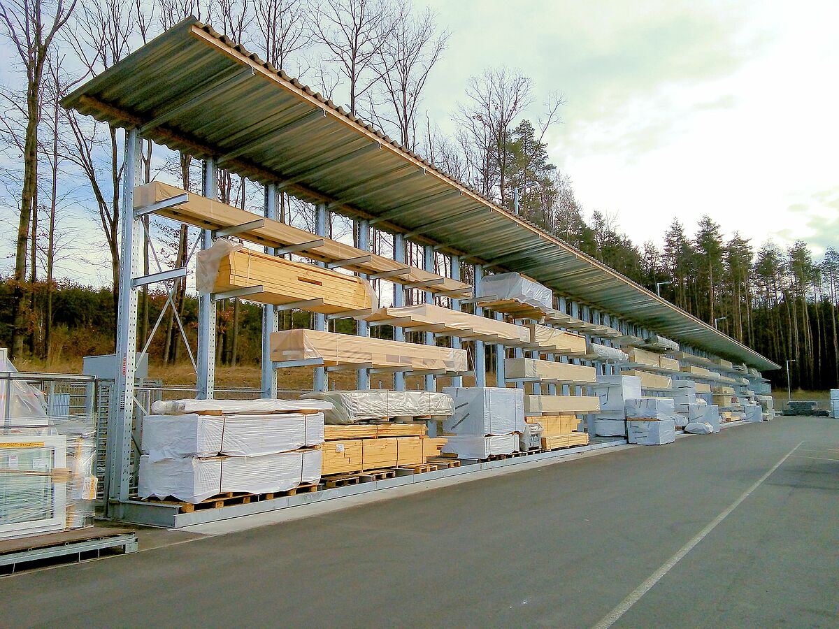 2019 wurde diese Regale durch weitere Zeilen ergänzt, so dass heute auf einer Gesamt-Regallänge von knapp 250 Metern Lagerraum für Langgut im Außenbereich zur Verfügung steht. Parallel dazu errichtet DFH Haus CZ eine neue Lagerhalle, die ebenfalls mit Regalen von OHRA ausgerüstet ist. Hier kamen sowohl Kragarm- als auch Palettenregale zum Einsatz. Die Kragarmregale sind dabei mit Gitterböden versehen, was für Artikel in den unterschiedlichsten Dimensionen eine durchgehende Lagerung ohne störende Zwischenstützen ermöglicht. Die Fachbreiten der Palettenregale wurde individuell an die Anforderungen von DFH Haus CZ angepasst. Dank der stabilen Konstruktion der OHRA-Regale, deren tragende Elemente alle aus vollwandigen Stahlprofilen gefertigt sind, erreichen die Regale selbst bei einer Fachbreite von 3,9 Metern noch eine Fachlast von 4 Tonnen.