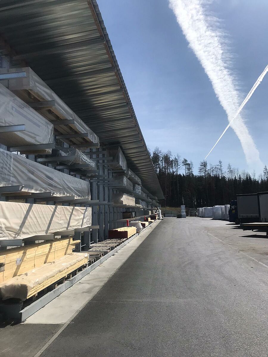 Insbesondere Fertighäuser der Marke Okal werden von DFH Haus CZ gefertigt – das sind keine Projekte von der Stange, sondern individuell geplante und ausgeführte, nachhaltige Häuser. Entsprechend umfangreich ist der Lagerbedarf für die zum Bau der Fertighauskomponenten benötigten Materialien. Um hierfür ausreichend Lagerkapazitäten bereitzuhalten, installierte das Unternehmen in 2018 erste Kragarmregale im Außenbereich, die dank Feuerverzinkung und Schrägdach Wind und Wetter trotzen. Die Regale sind rund 6 Meter hoch und bieten bis zu fünf Lagerebenen, wobei jeder der 1.200 Millimeter langen Arme ein Gewicht von bis 1 Tonne trägt.