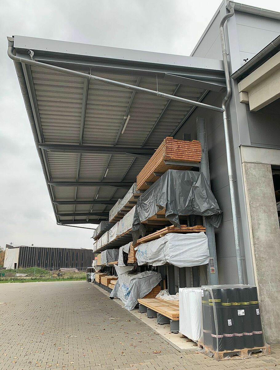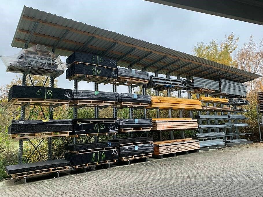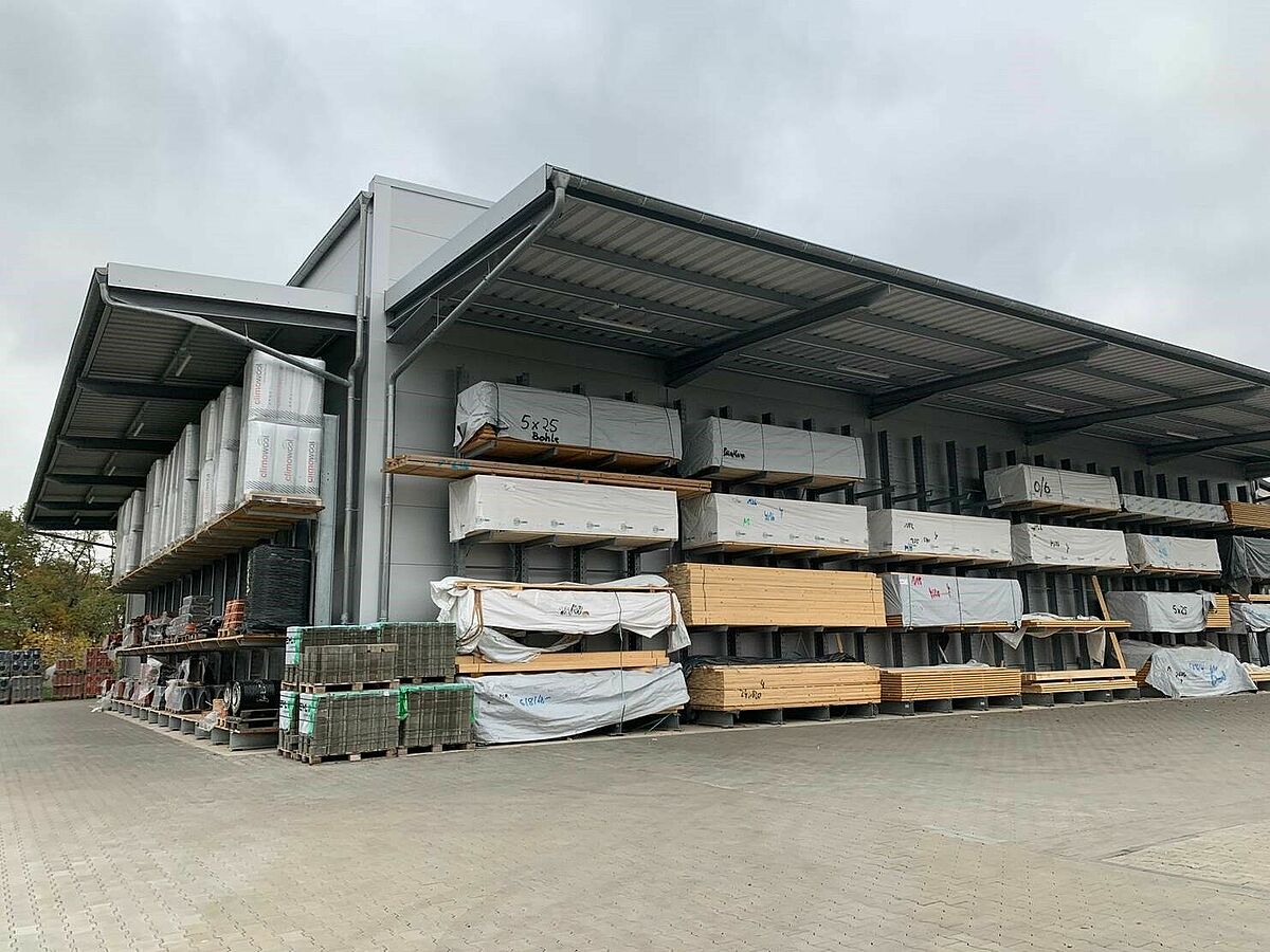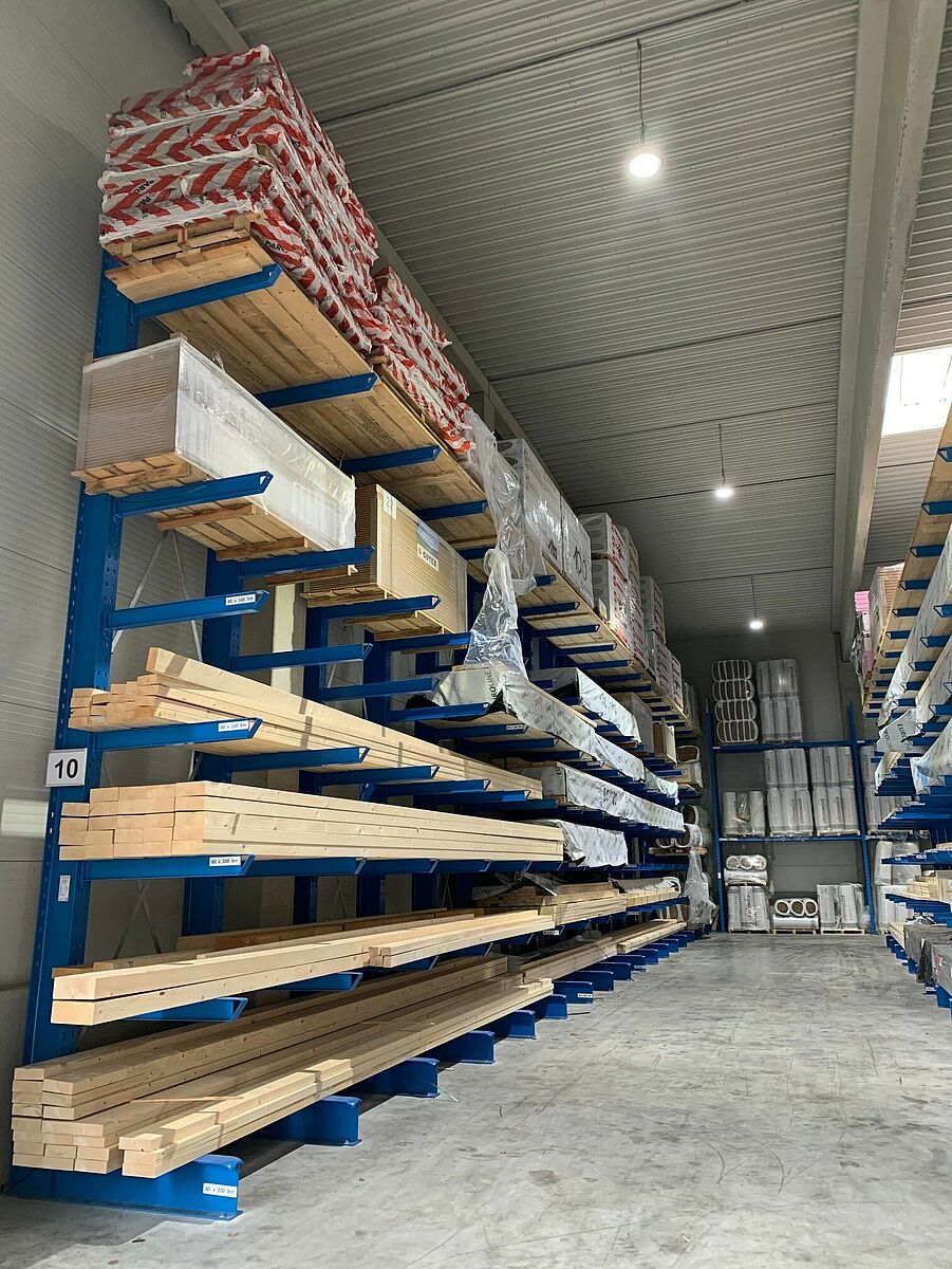 Die neu errichtete, 12 Meter hohe Lagerhalle entstand auf einer Fläche von 1.000 Quadratmetern und bietet zusätzlichen Platz für neue Artikel wie Fassadenpaneele, Dämmplatten oder Konstruktionsvollholz. Viele der jetzt komfortabel und geschützt in Regalen untergebrachten Artikel wurden früher im Außenbereich und auf dem Boden gelagert. So konnte mit den bis zu 6,58 Meter hohen Palettenregalen und rund 7 Meter hohen Kragarmregalen sowohl die Lagerkapazität erweitert, als auch der Zugriff auf die Waren deutlich verbessert werden. Insgesamt installierte OHRA vier rund 18 Meter lange Regalzeilen, bestehend aus Paletten- und Kragarmregalen, sowie entlang der Innenwände der Halle zwei 25,5 Meter lange Kragarmregale mit sechs Lagerebenen. Weitere Kragarmregale bieten im Außenbereich Platz für unempfindlichere Baustoffe.