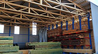 Bei Farkas-Fa bilden zwei jeweils 12,4 Meter lange Kragarmregale die Wände. Da die Stützen der OHRA-Regale aus warmgewalzten Stahlprofilen gefertigt sind und somit eine hohe Tragkraft bieten, ermöglichen sie große Spannweiten bei der Dachkonstruktion: Bei Farkas-Fa beträgt der Abstand zwischen den beiden Regalzeilen 15 Meter. So kann später problemlos eine dritte Regalzeile in der Mitte der Halle platziert werden. Sarok-Fa entschied sich dagegen für eine Regalhalle ohne Seitenwände – dadurch kann Luft ungehindert durch das gelagerte Holz streichen und es nachtrocknen. Als tragende Konstruktion dienen drei Zeilen doppelseitiger Kragarmregale. Für Sarok-Fa war ein wichtiges Feature der OHRA-Regale, dass sich die flexibel eingehängten Kragarme in einem 100 Millimeter Raster werkzeuglos verstellen lassen. So können die Regale jederzeit an ein wechselndes Produktsortiment angepasst werden.