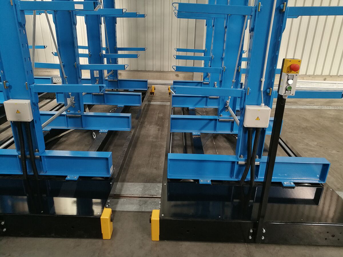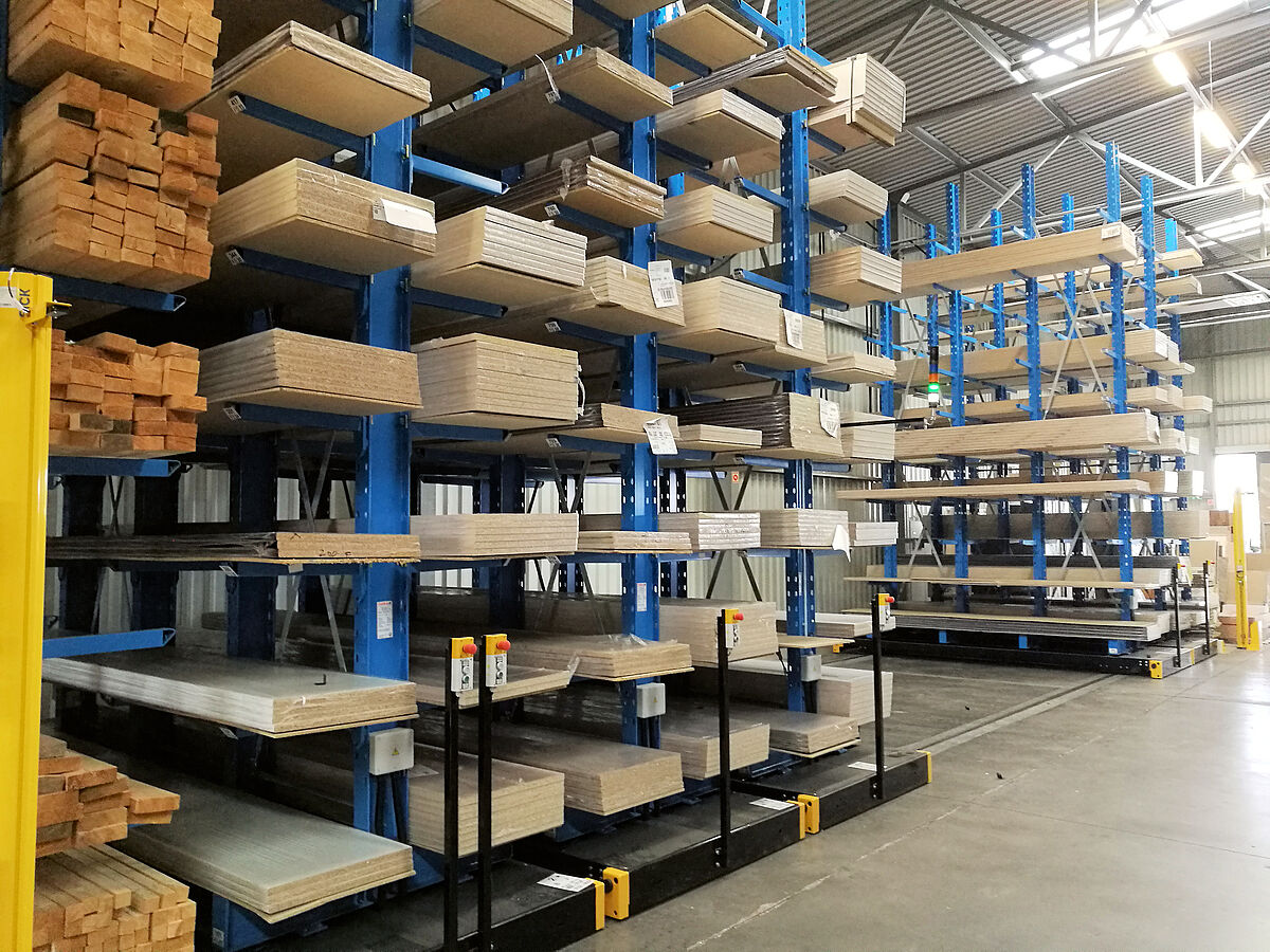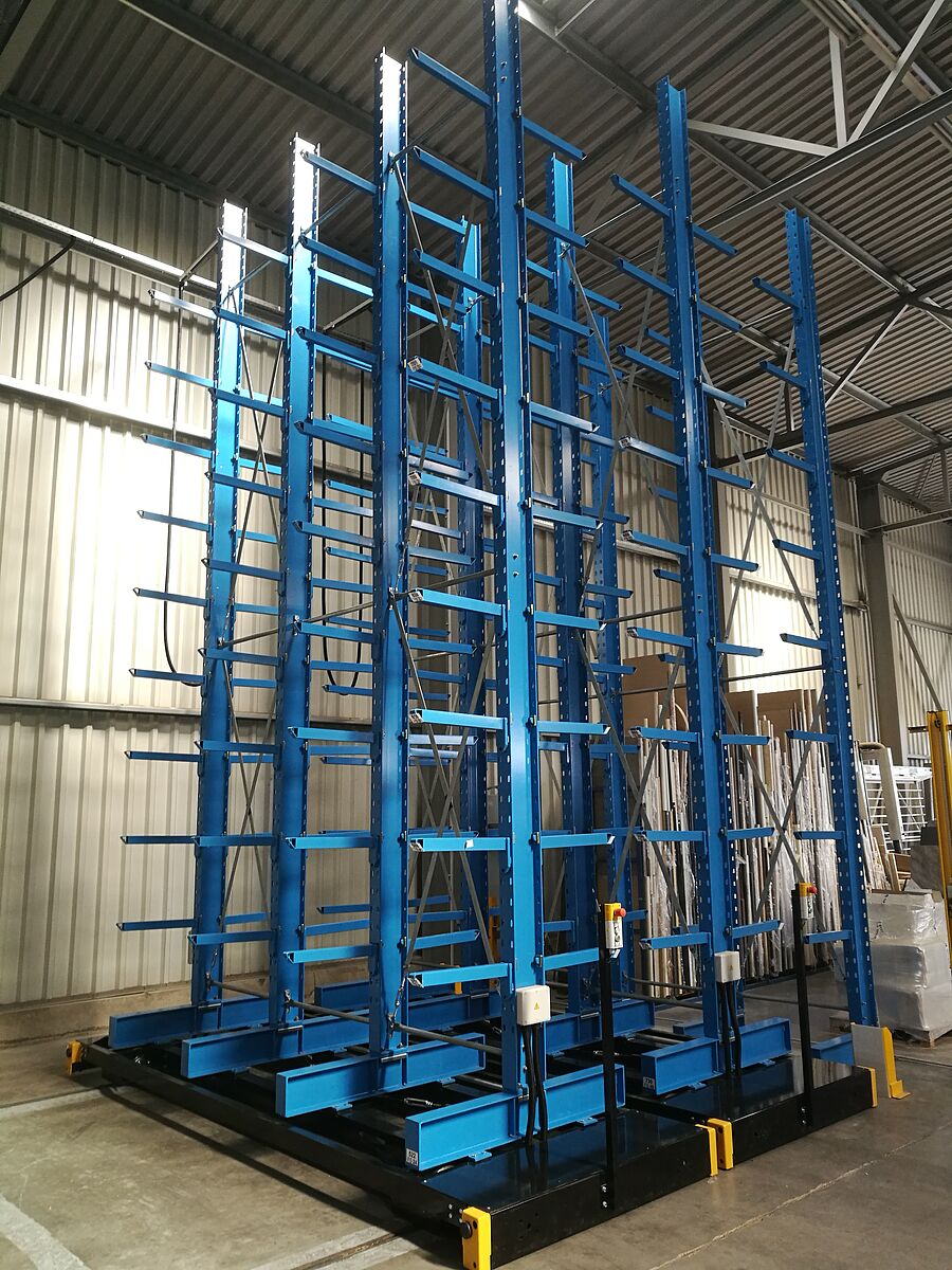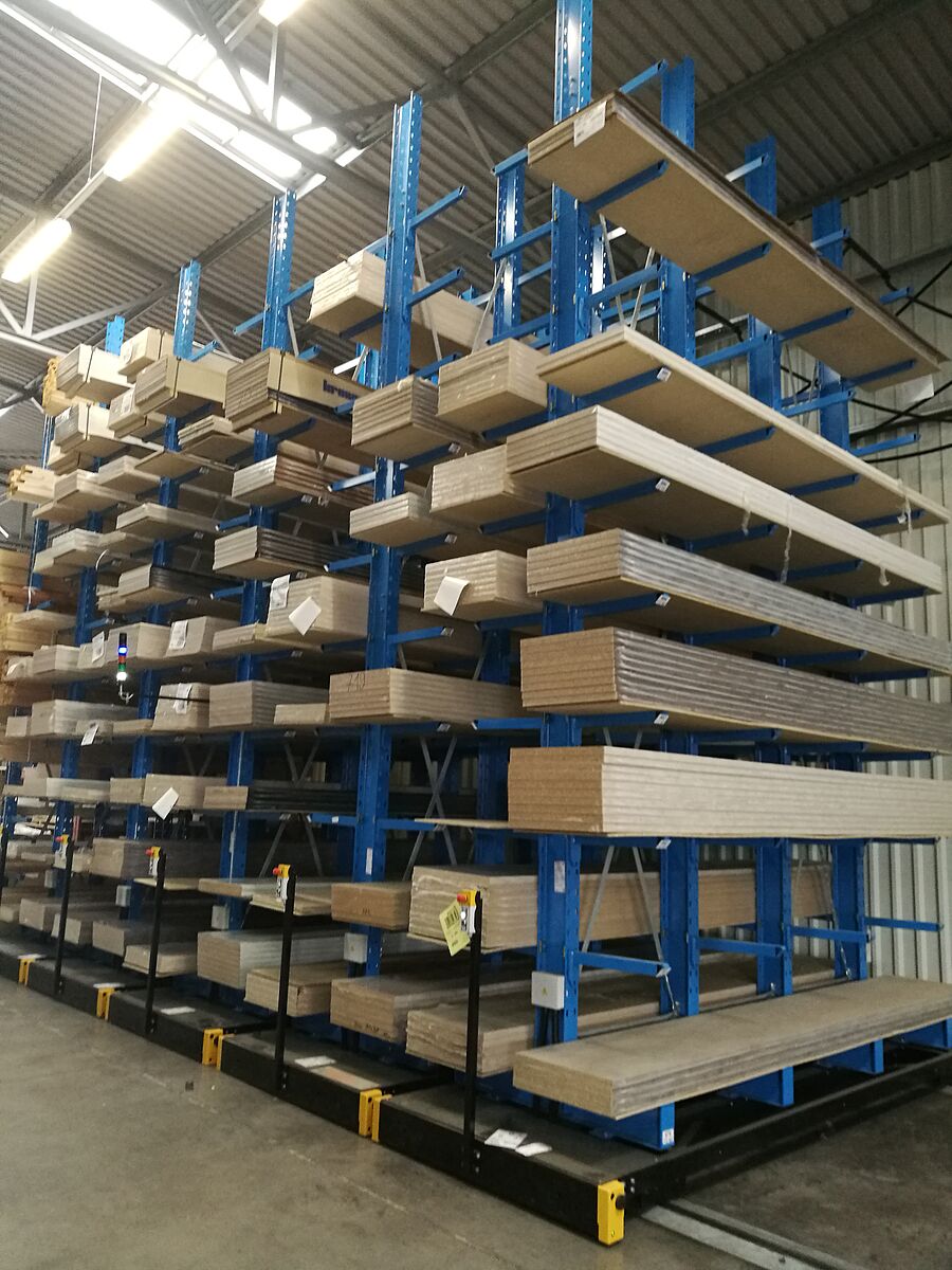 Das neue Lager für Küchenarbeitsplatten besteht aus insgesamt sieben Regalzeilen. Jede Zeile ist 6.600 Millimeter hoch, 3.300 Millimeter lang und besteht aus jeweils vier Ständern, an denen neun Kragarme flexibel eingehängt sind. So ergeben sich insgesamt zehn Lagerebenen – die unterste Ebene liegt auf den Ständerfüßen. Die äußeren Zeilen sind einseitig ausgeführt und am Boden fixiert, die restlichen Zeilen sind auf Verfahrwagen montiert, die sich auf im Boden verlegten Schienen bewegen. Die Verfahrwagen stehen mit den auf ihnen montierten Regalen dicht an dicht. Werden Waren aus einem Regal benötigt, fahren die Verfahrwagen auseinander und öffnen den gewünschten Gang. Die Steuerung erfolgt dabei vom Gabelstapler aus per Fernbedienung – eine manuelle Bedienung ist ebenfalls möglich. Mit einem derartigen System ist eine höchstmögliche Raumnutzung möglich, nahezu 100 Prozent mehr Lagerkapazität können im Vergleich zu herkömmlichen „starren“ Regalen erreicht werden.