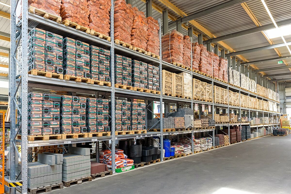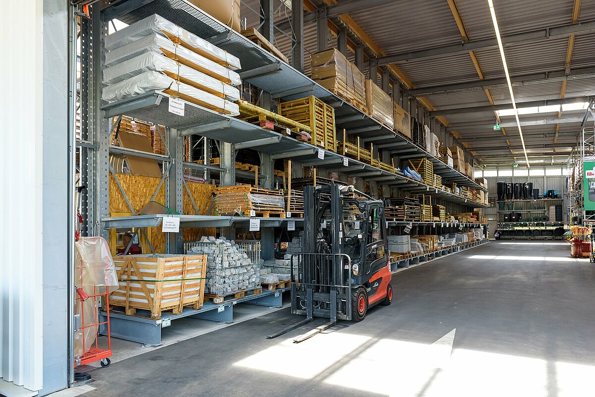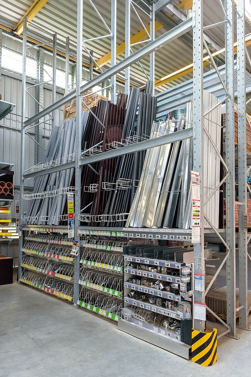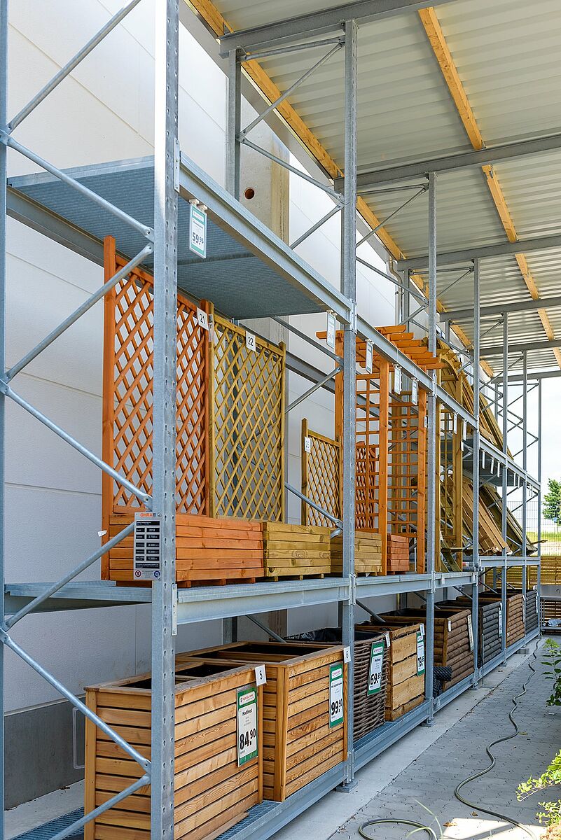 Zur Lagerung der Garten- und Holzartikel entschied sich Jos. Schneider für eine Mischung aus bis zu 48 Meter langen Kragarm- und Palettenregalen. Um eine durchgehende Lagerung verschiedenster Artikel in den Kragarmregalen zu realisieren, wurden alle Lagerebenen mit Gitterrosten ausgestattet. Durch den Einsatz von vollwandigen Stahlprofilen für alle tragenden Elemente erreichen die Regale von OHRA eine hohe Tragkraft, zudem können die Profile bei Stößen elastisch nachgeben und behalten dauerhaft ihre statischen Eigenschaften bei. Damit bieten sie auch eine dauerhafte Basis für Dach und Wände.