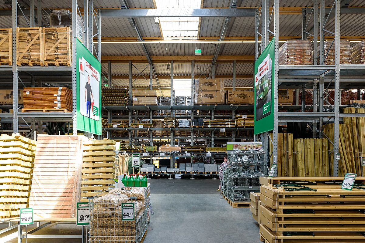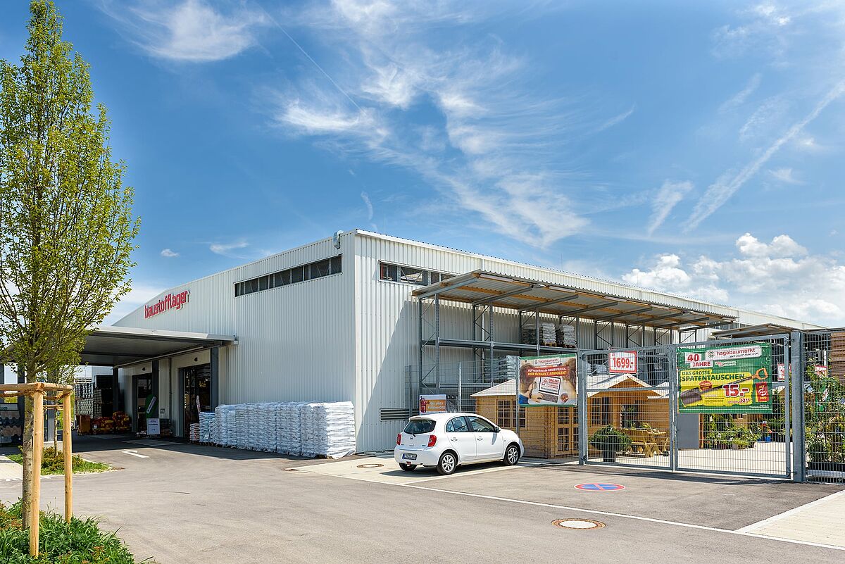 Auf der großzügigen Verkaufsfläche des Ende 2018 eröffneten Standorts kann das komplette Hagebau-Sortiment mit Gartencenter und Baustoffhandel angeboten werden. Alleine die Drive-in-Halle umfasst eine Fläche von rund 2.000 Quadratmetern.