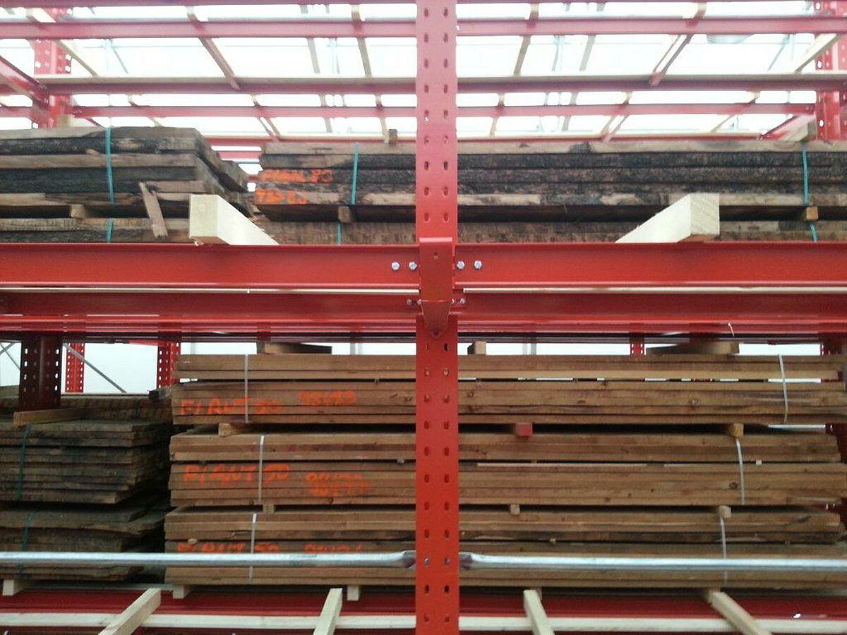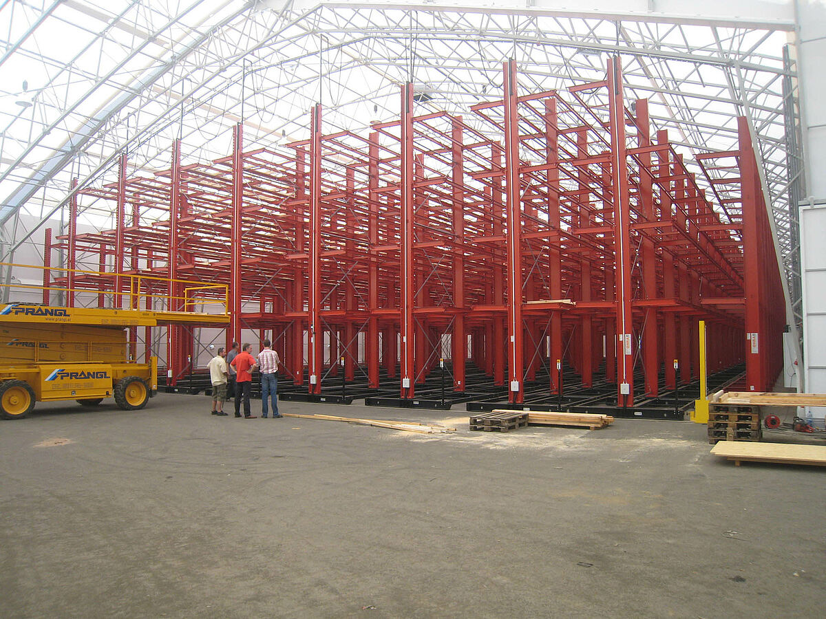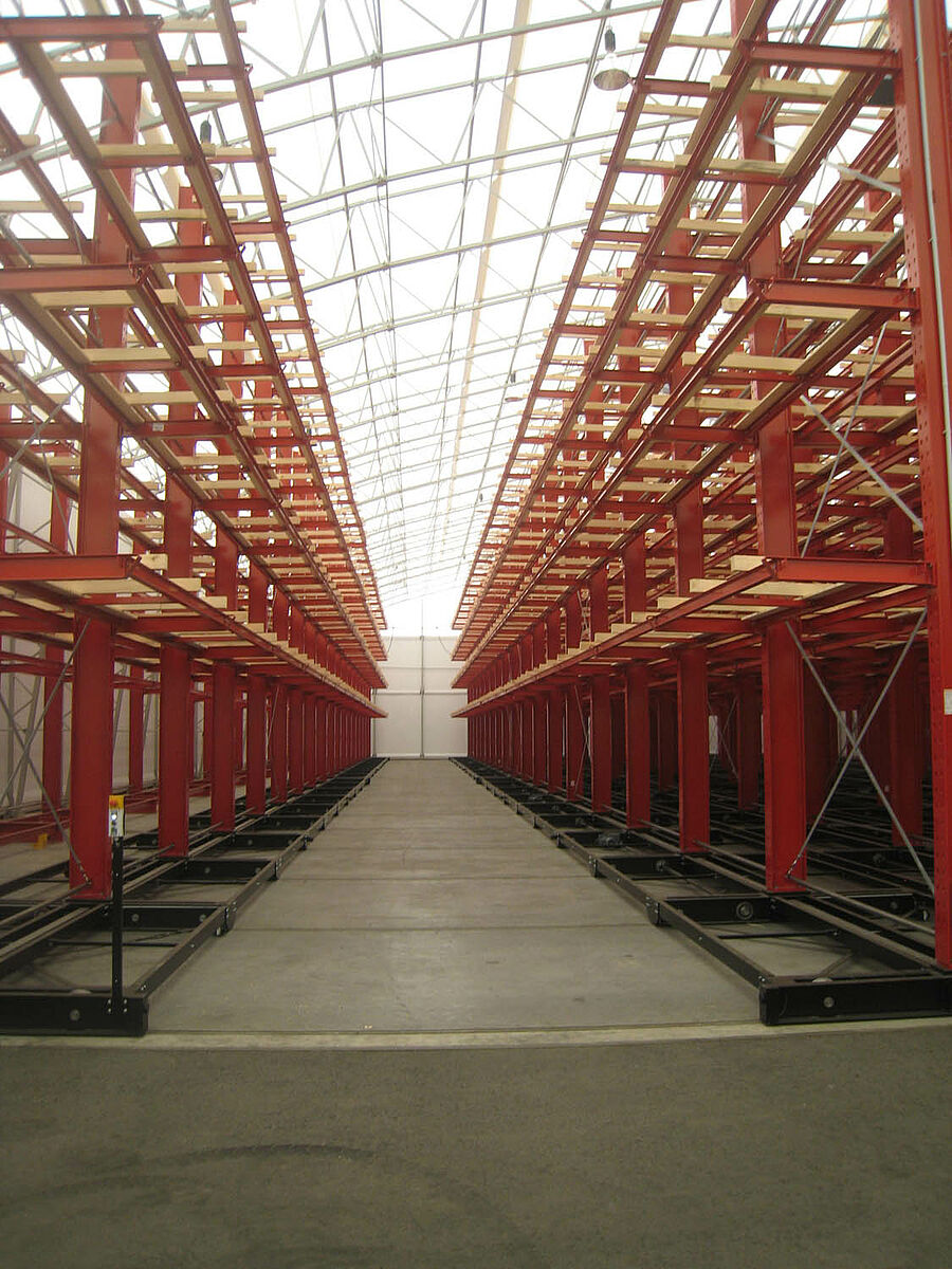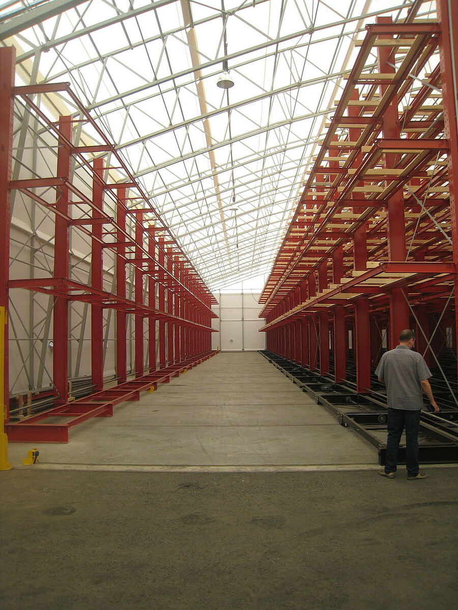 OHRA übernahm den Aufbau der kompletten Regalanlage. Dazu gehörte auch die Montage der für die Verfahrwagen benötigten Schienen, die noch vor dem Bau der eigentlichen Halle im Freien stattfand. Von den insgesamt zehn 60 Meter langen und mit vier bis fünf Ebenen bis zu 9,2 Meter hohen Kragarmregalen wurden zwei fest im Boden verschraubt. Die restlichen acht wurden auf 58 Meter langen Verfahrwagen von OHRA montiert. Die Verfahrwagen werden elektrisch angetrieben und lassen sich über eine Fernsteuerung vom Stapler aus auseinanderfahren. Nur die gewünschte Gasse öffnet sich – so wird die Lagerkapazität auf einer vorhandenen Fläche nahezu verdoppelt.
