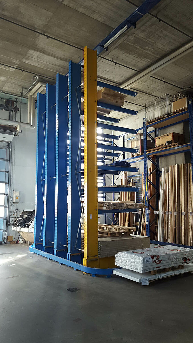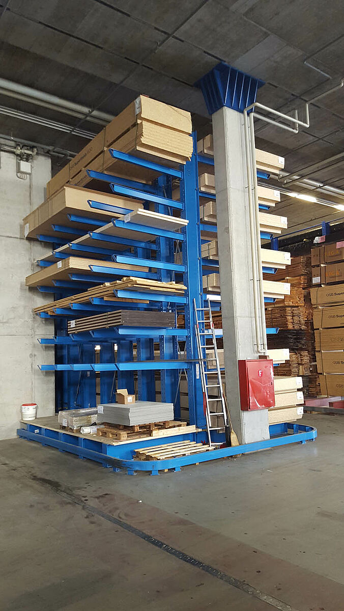 Da das Lager Platz für die unterschiedlichsten Platten – Massivholzplatten, OSB-, Span, Sperrholz-, MFP-Platten und auch empfindliche Furnierspanplatten – bieten sollte, war ein multifunktionales Regalsystem erforderlich. Gfeller erweiterte daher das vorhandene Lager durch Kragarmregale von OHRA: Das Unternehmen mit Sitz in Kerpen, Deutschland, ist europäischer Markführer für Kragarmregale. Alle tragenden Elemente seiner Regale sind aus vollwandigem, warmgewalztem Stahl gefertigt. Die stabile Konstruktion erlaubt große Lagerhöhen sowie eine schlanke Bauweise und ermöglicht somit eine hohe Flächennutzung. Bei Gfeller wurden über 7 Meter hohe Stützen eingesetzt, mit denen eine Lagerung auf neun Ebenen realisiert werden konnte.