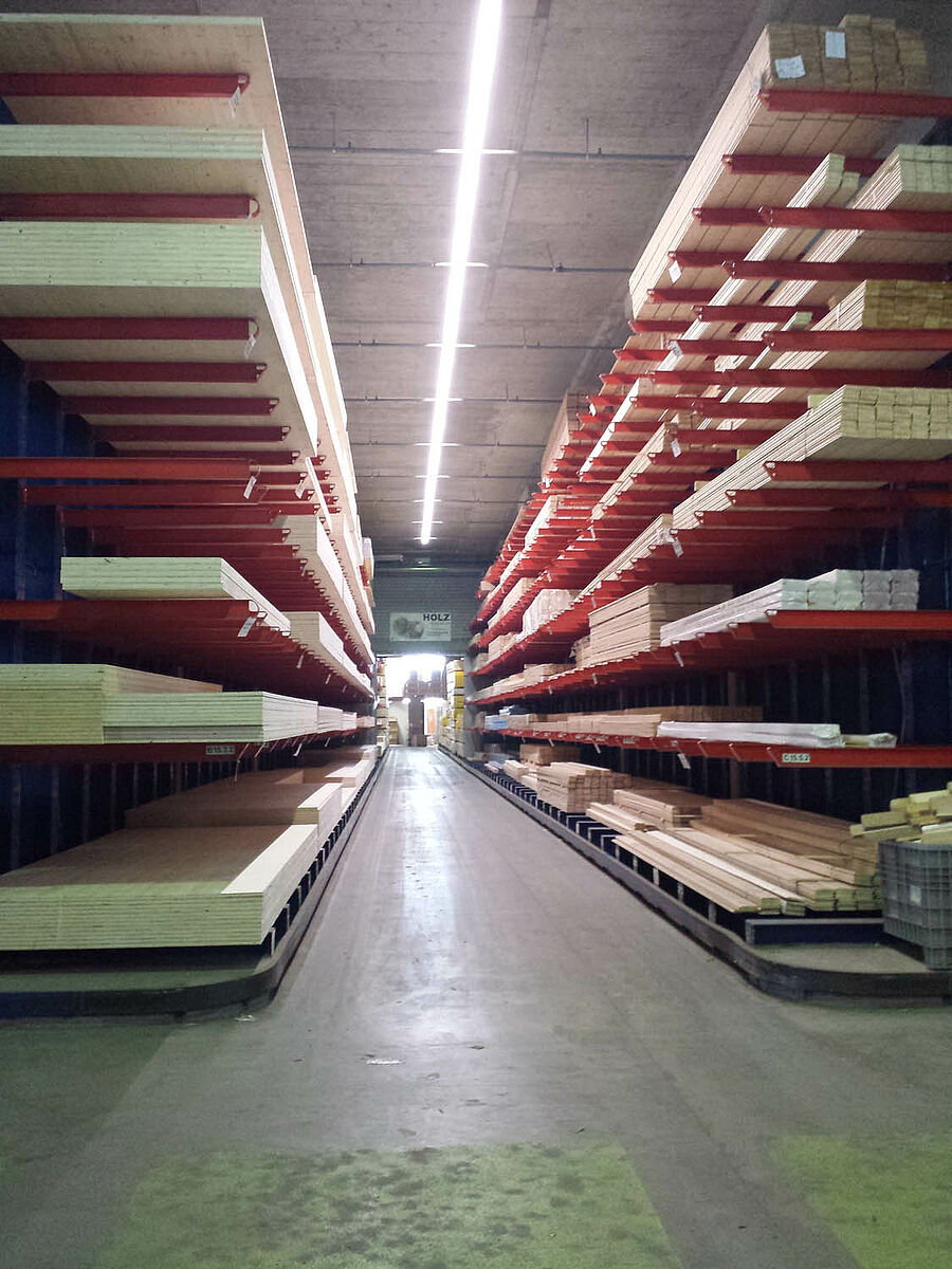 Gfeller investierte insgesamt rund 100.000 Euro in die Lagererweiterung. Sieben verschieden lange Zeilen ein- und zweiseitiger Regale bieten heute deutlich mehr Lagerplatz und ermöglichen effizientere Prozesse im Lager. Durch verschiedene Armlängen mit 1.850, 2.000 und 2.500 Millimetern Länge und Traglasten von 1.000 Kilogramm (bzw. 850 Kilogramm bei den 2.5 Meter langen Armen) konnten die Regale auf die örtlichen Begebenheiten und die verschiedenen Lagerwaren maßgeschneidert werden.