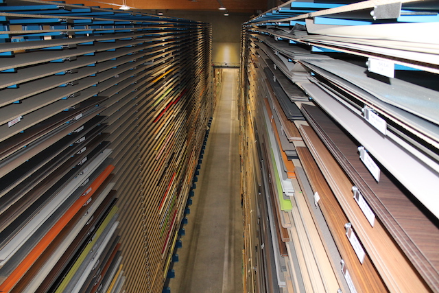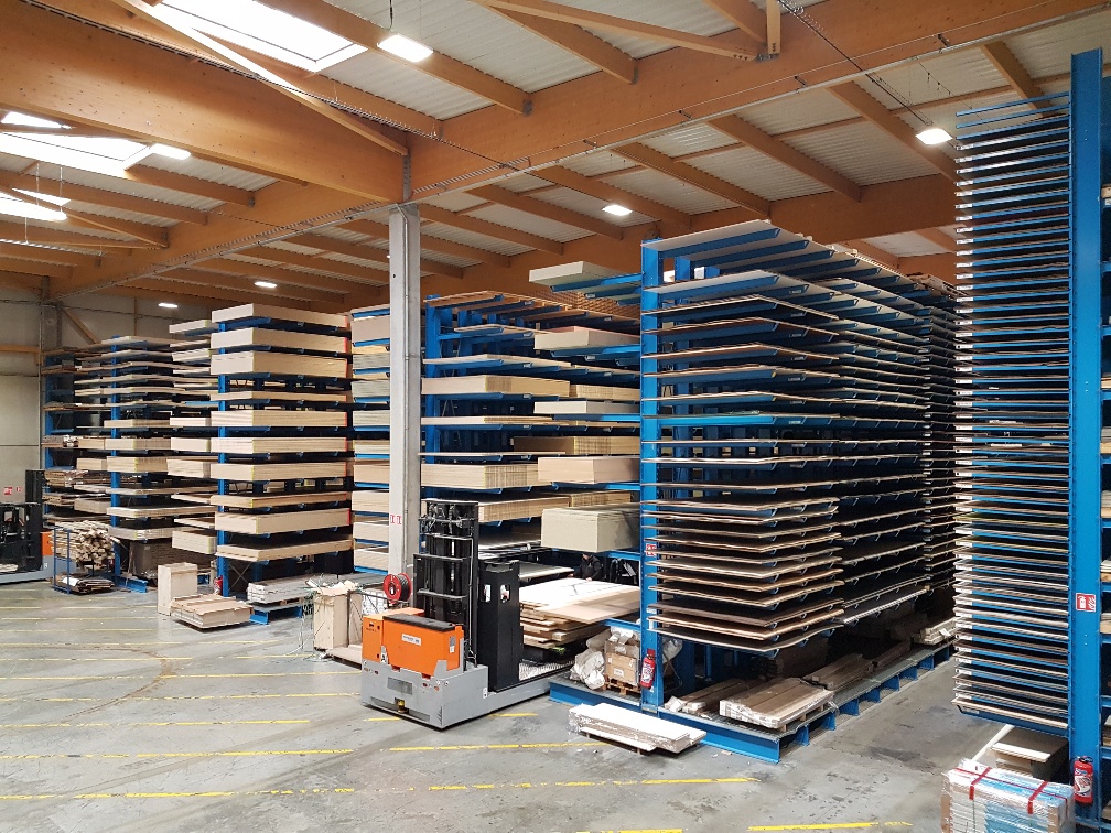 Zusätzlich installierte OHRA eine Lagerbühne, auf welcher oben und unten Fachbodenregale platziert sind. In ihnen werden zum Beispiel Kantenumleimer oder Beschläge gelagert. Diese Erweiterung der Lagerfläche um eine weitere Etage ermöglicht eine optimale Ausnutzung des zur Verfügung stehenden Raumes.