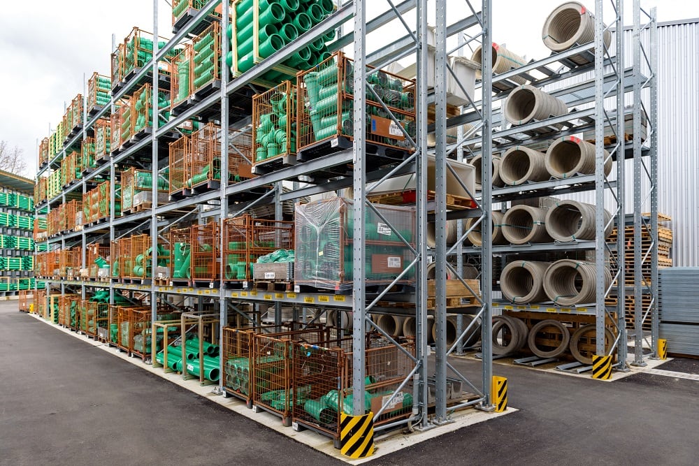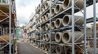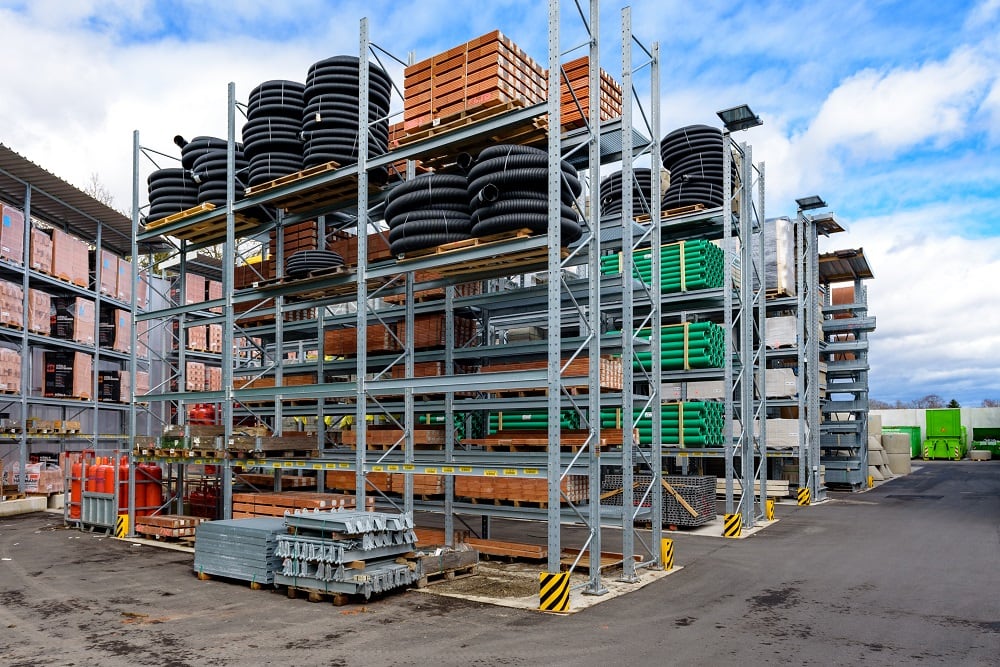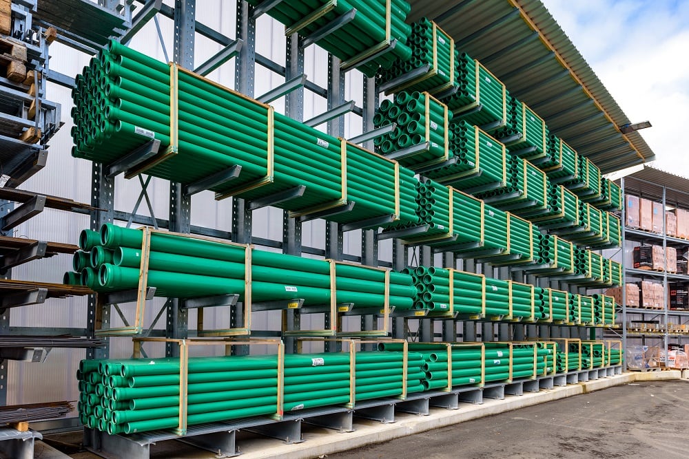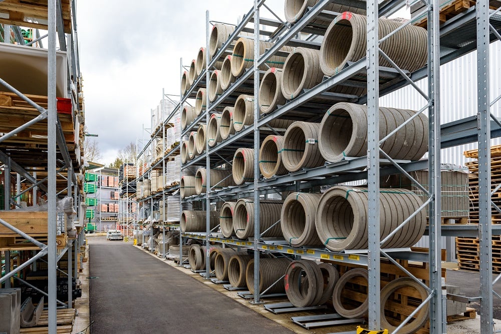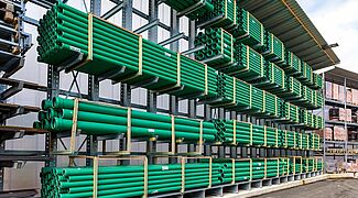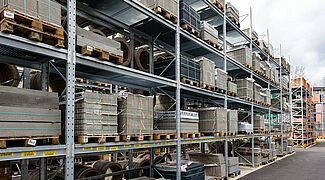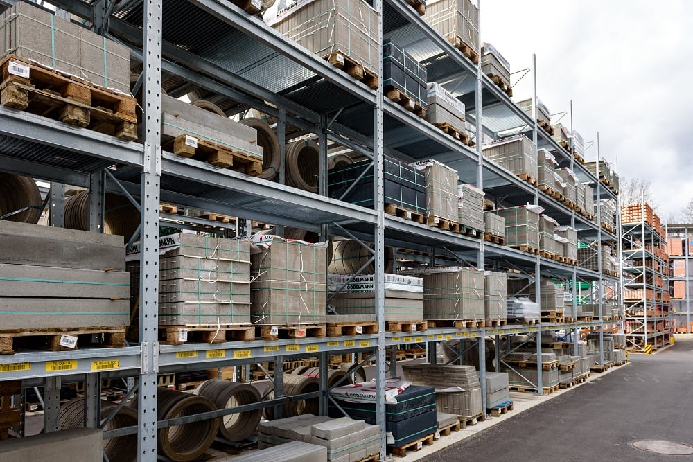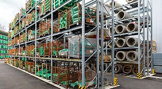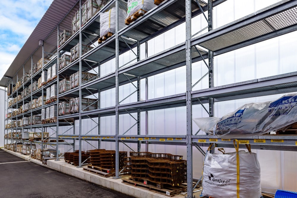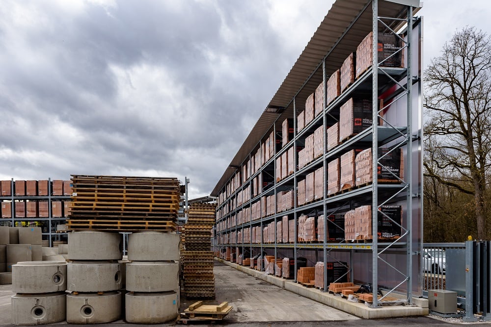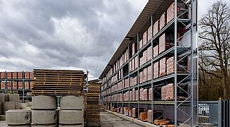 Für die Lagerung dieser Vielzahl an unterschiedlichen Materialien rüstete Kraft das neue Außenlager erneut mit Paletten- und Kragarmregalen von OHRA aus. Sie konnten schon in anderen Niederlassungen das Baustoffhändlers durch ihre Qualität überzeugen. Denn OHRA verwendet für die tragenden Elemente seiner Regale ausschließlich vollwandige Stahlprofile. Das ist die Basis für die hohe Tragfähigkeit und schlanke Bauweise der Regale. Die Palettenregale bieten Fachlasten von bis zu 4.500 Kilogramm, die Ständer der Kragarmregale tragen bis zu 5.000 Kilogramm, jeder einzelne Arm bis zu 1.000 Kilogramm.