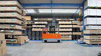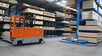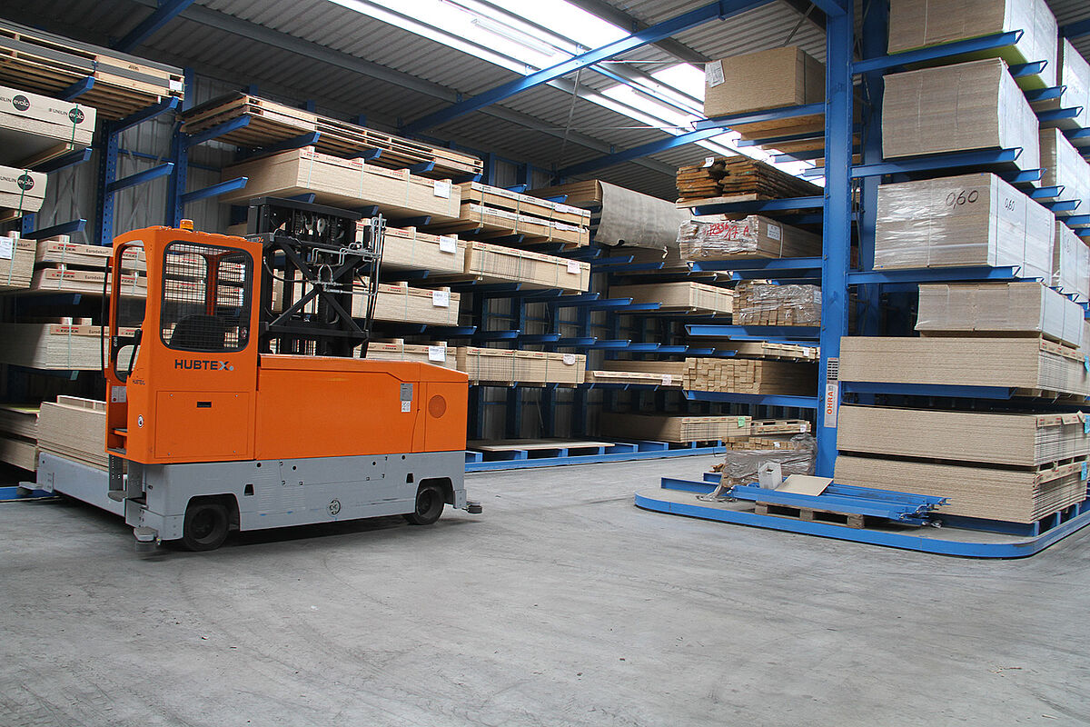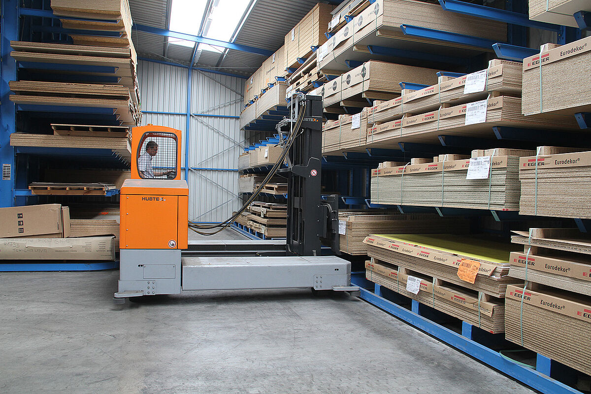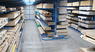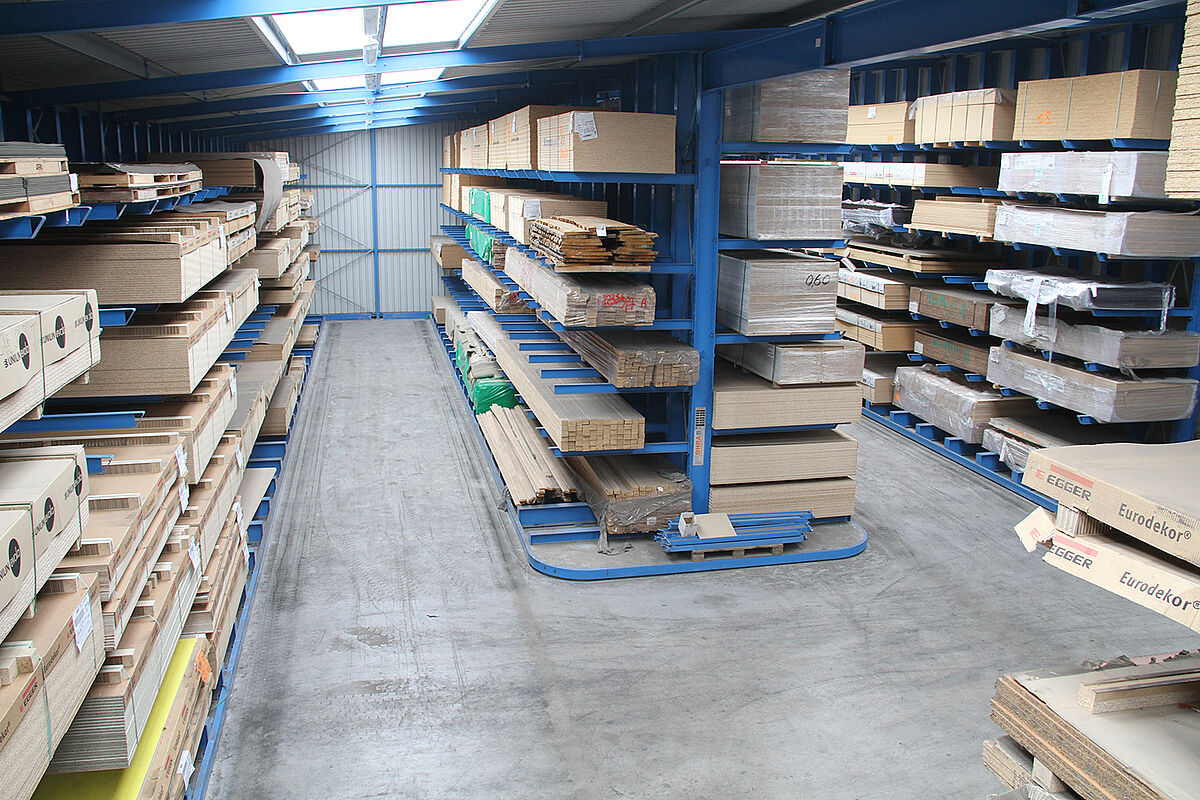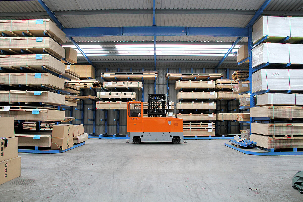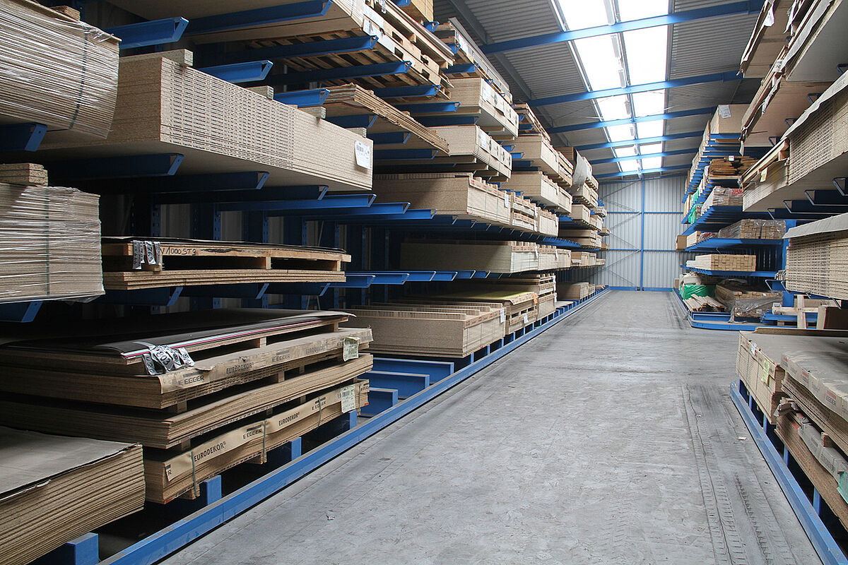 So ist eine 38 Meter lange Halle entstanden, deren Außenwände aus jeweils einem einseitigen Kragarmregal bestehen. Zusätzlich wurde ein zweiseitiges Kragarmregal mittig zwischen diesen beiden Regalen angeordnet. Führungsschienen erlauben den Einsatz eines Mehrwege-Seitenstaplers im Schmalgang. Mittels der individuell zugeschnittenen Regale mit Höhen von 5,5 Metern, 6,3 Metern und 7,1 Metern konnte die Halle optimal an die Umgebung angepasst werden. Jeder der 1.850 Millimeter langen Kragarme trägt eine Last von bis zu 600 Kilogramm. Dabei sind die Kragarme nicht verschraubt oder verschweißt, sondern werden flexibel in einem 100-Millimeter-Raster in die Regalständer eingehängt. So können sie bei Stößen nachgeben.