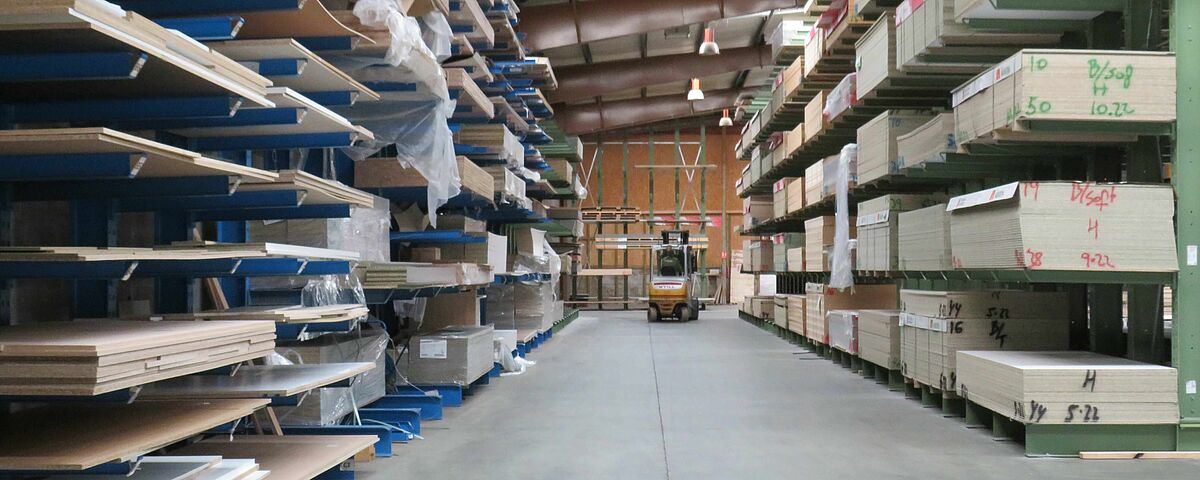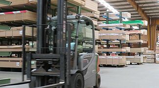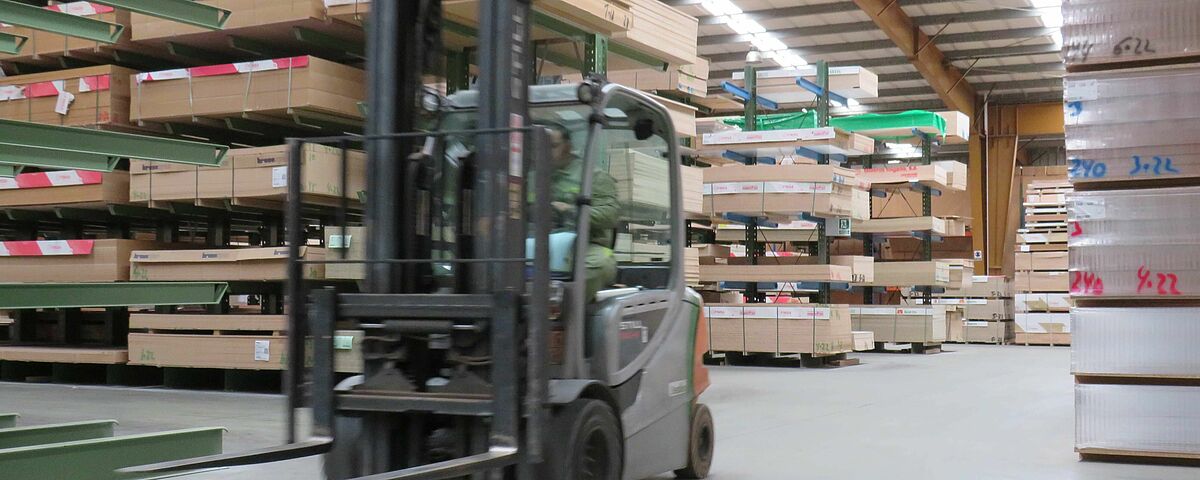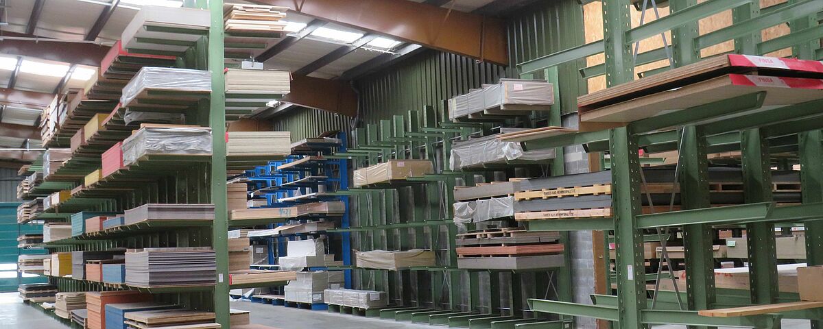 OHRA installierte daher in dem Lagerbereich verschiedene Regalsysteme: Dazu gehören Kragarmregale, deren 1.300 Millimeter langen Arme jeweils eine Traglast von 750 Kilogramm haben; die oberste Lagerebene liegt bei 5 Metern. Hier werden vor allem Platten gelagert, die einen hohen Umsatz haben und entsprechend schnell ausgelagert werden müssen. Da im Bereich der HPL-Platten eine Vielzahl an unterschiedlichen Artikeln untergebracht werden musste, die auf speziellen, 3050 x 1.300 Millimeter großen Paletten gelagert werden, kommt hier ein Palettenregal zum Einsatz: Bei einer Länge von rund zehn Metern und einer Höhe von circa 6 Metern verfügt es über 15 Lagerebenen. So entsteht eine Vielzahl an Lagerfächern, was eine artikel-reine Lagerung pro Regalfach ermöglicht und damit einen schnellen Zugriff auf die Ware.
