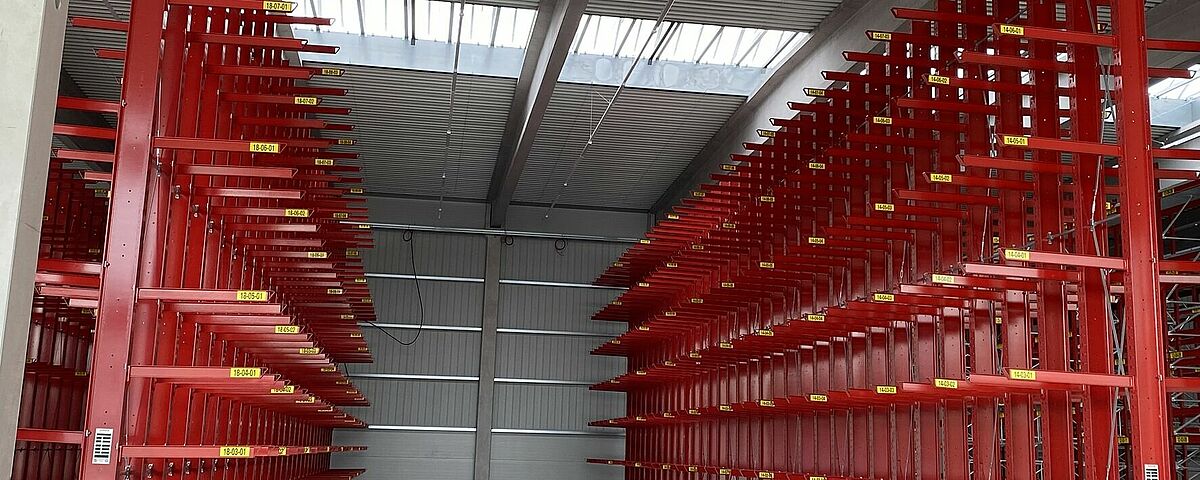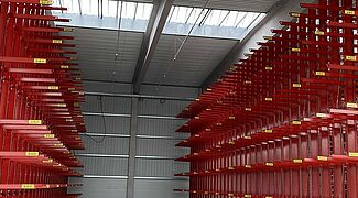 Höhere Lagerkapazitäten, schonendere Lagerung von Baustoffen und Holz, kürzere Transportwege - die Entscheidung des Baustoffhändlers Mayrose, am neuen Standort in Lingen nicht mehr im Blocklager, sondern in Regalen von OHRA zu lagern, führte zu einem klar strukturierten und deutlich effizienteren Lager. Rund 1.800 Lagerplätze in sechs Paletten- und drei Kragarmregalzeilen bietet die überdachte Anlage. Die für den Baustoffhandel eher ungewöhnliche maximale Lagerhöhe von 7,4 Metern ermöglicht eine hohe Ausnutzung der zur Verfügung stehenden Fläche.