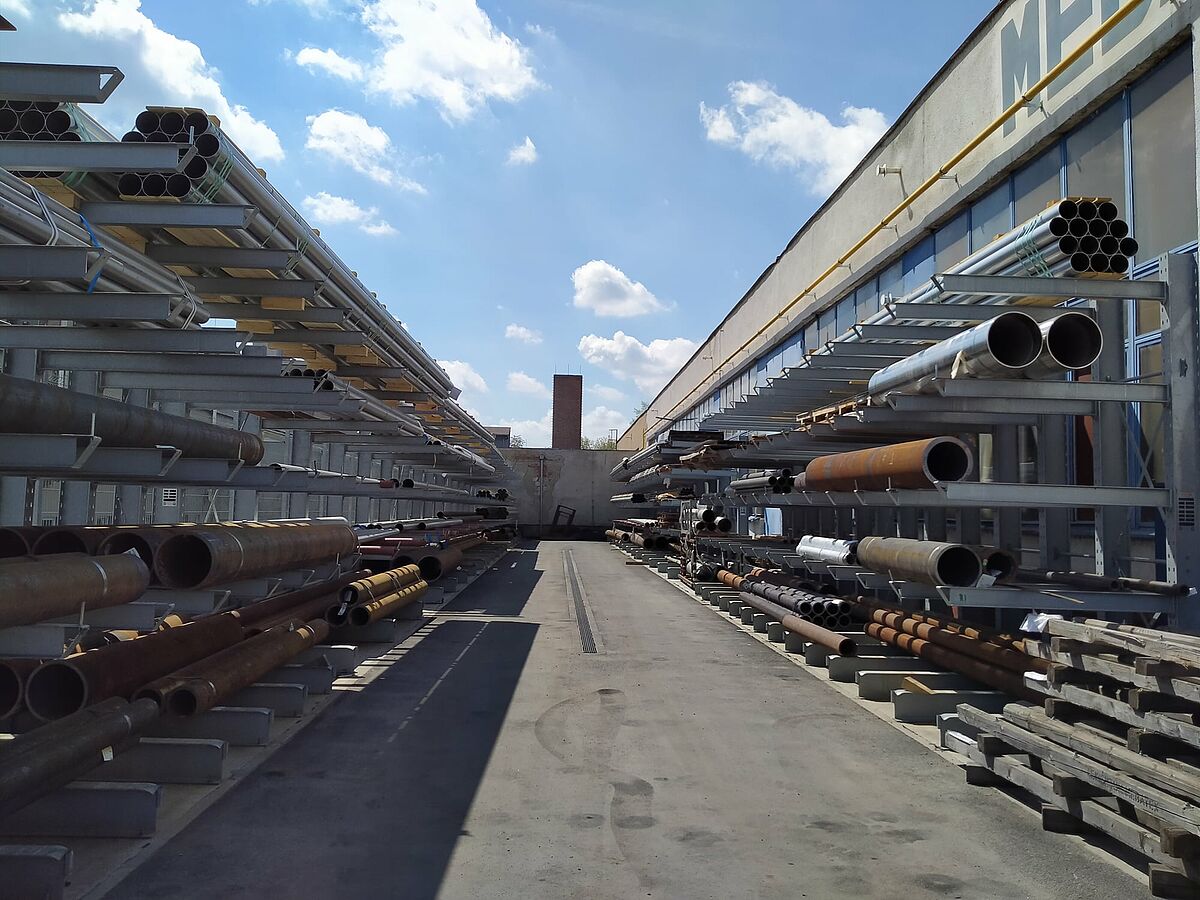 Das tschechische Unternehmen Mebatex, das am Standort Brno Walzen für die Textilmaschinenindustrie fertigt, hat mit Kragarmregalen von OHRA die Kapazitäten seines Außenlagers vervielfacht. Bisher lagerten die Stahlrohre, die das Ausgangsmaterial für die Walzen bilden, auf dem Boden. Durch den Einsatz der Schwerlast-Kragarmregale kann nun die „dritte Dimension“ erschlossen und so auf gleicher Fläche deutlich mehr Material gelagert werden. Gleichzeitig wird der Zugriff auf die jeweils benötigten Rohre beschleunigt und die Bestandsübersicht verbessert.