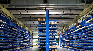 Damit waren die Rahmenbedingungen für die Kragarmregalanlage gesetzt: Oberste Lagerebene auf 5,25 Metern, zehn Lagerebenen, Fachlast 4 Tonnen, Feldlast 40 Tonnen. „Nur wenige Regalhersteller haben Standardregale für diese hohen Lasten im Programm“, so Wiedmann. OHRA konnte dagegen ein passendes Konzept bieten. Durch den Einsatz aus vollwandigen Stahlprofilen für alle tragenden Elemente sind die Kragarmregale des Kerpener Unternehmens enorm tragfähig. „Wichtig war für uns auch die feine Rasterung der eingehängten Kragarme von nur 5 Zentimetern“, ergänzt Wiedmann. „So können wir die Fachhöhen sehr genau an die tatsächliche Höhe der Bunde anpassen. Damit lagern wir entsprechend wenig Luft bzw. können wir die erforderlichen Hubhöhen minimieren – jeder eingesparte Zentimeter reduziert die Zeit beim Handling.“