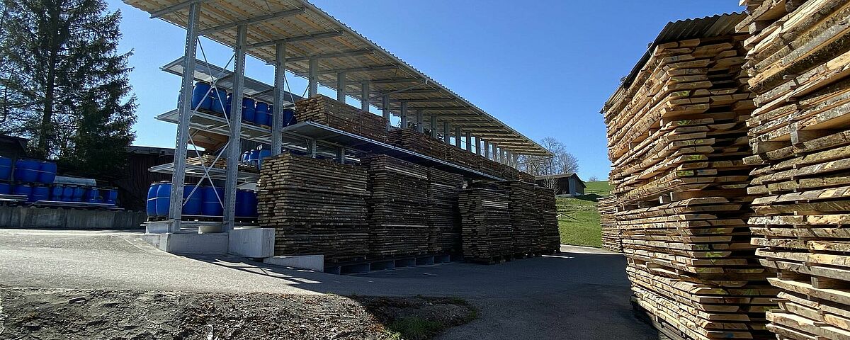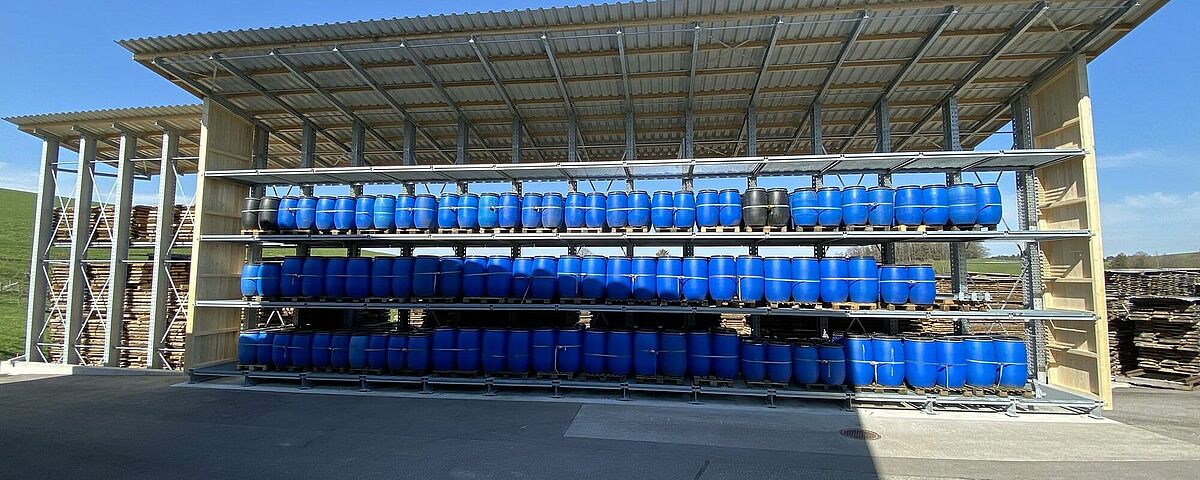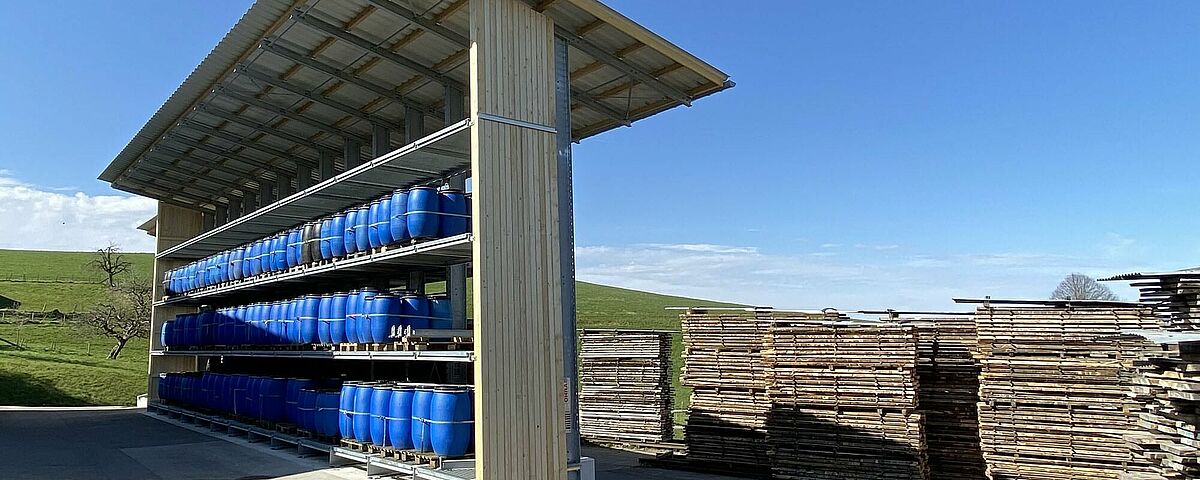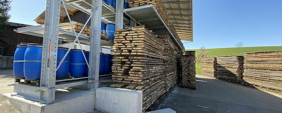 Bis dato lagerte Nyfeler Buchenklotzbretter, die die Schreinerei unter anderem für die Fertigung des CUBORO Kugelbahnsystems verwendet, sowie Brennholz und andere Artikel gestapelt im Freien. Doch die dabei verwendeten Euro-Paletten verwitterten ständig, was zu gefährlich schiefen Stapeln führte. Um an die Ware zu gelangen, mussten die Artikel zudem umständlich umgestapelt werden. Zum Schutz vor der Witterung deckte Nyfeler darüber hinaus jeden Stapel mit Planen ab – was einen großen zusätzlichen Aufwand beim Handling bedeutete. Nicht zuletzt beanspruchte das Lager eine übermäßig große Fläche.