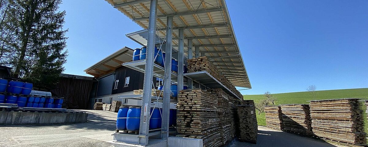 Das stark geneigte Terrain und enge Platzverhältnisse stellten besondere Anforderungen an die Planung eines neuen Außenregals für die Schreinerei Nyfeler Holzwaren AG. OHRA hat das doppelseitige Kragarmregal schließlich in eine Ost- und eine Westseite aufgeteilt, die trotz unterschiedlicher Bodenhöhen und eines zueinander versetzten Aufbaus von einem gemeinsamen, sechs Meter tiefen Dach geschützt werden. Nyfeler gewinnt mit dem Regal deutlich mehr Lagerfläche, spart Zeit beim Ein- und Auslagern und hat dank des Schutzes vor direkten Witterungseinflüssen weniger Schäden an der Lagerware.