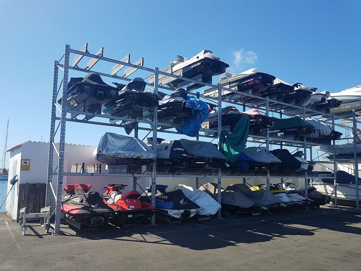 Basis der Regalanlage bilden Palettenregale von OHRA, die an die speziellen Anforderungen der Marina angepasst und auf die Dimensionen der Boote maßgeschneidert wurden. Für größere Boote wurden drei zweireihige Regalzeilen installiert. Die zweigeschossigen Regale bieten eine Lagerfachtiefe von 3,8 Metern. Um auch Jet-Skis und kleinere Boote platzsparend lagern zu können, wurde zudem eine dreigeschossige, einreihige Regalzeile montiert. Entscheidendes Kriterium für die Marina, auf die Regalkonstruktion von OHRA zu setzen, war die Qualität der verwendeten Materialien und die Robustheit: OHRA verwendet ausschließlich vollwandige, warmgewalzte Normbaustähle für die tragenden Elemente seiner Regale. Das gewährleistet nicht nur die notwendige Tragfähigkeit, sondern trotzt auch dem rauen Meeresklima in Pasito Blanco. Die zusätzliche Feuerverzinkung sorgt dafür, dass die Regale auch nach Jahren im Außeneinsatz ihre Tragfähigkeit nicht verlieren und der gepflegten Optik der eingelagerten Boote gerecht werden. Und wenn es dann wieder hinaus ins Segelrevier gehen soll, reicht ein Anruf bei der Marina, und das Boot wird für neue Turns wieder zu Wasser gelassen.