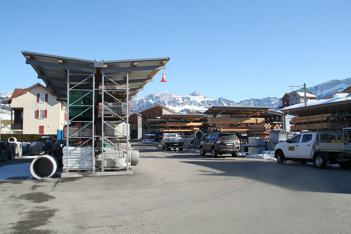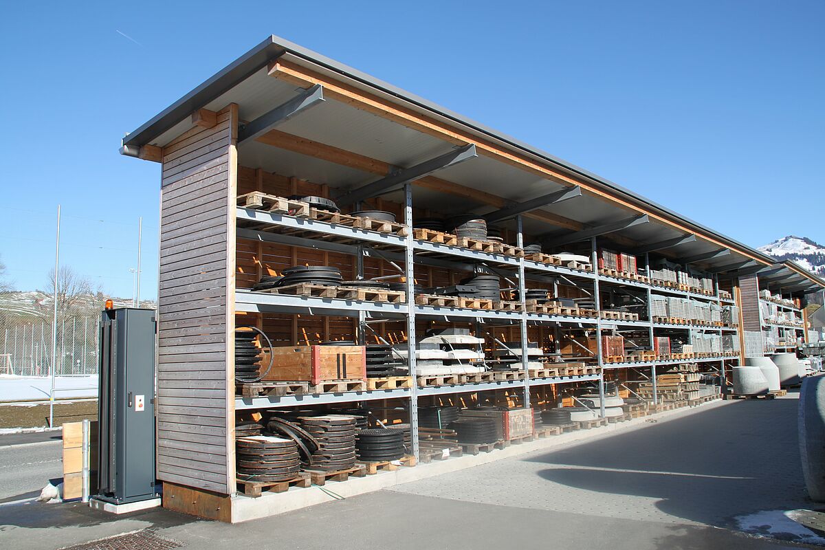 Die im Außenbereich aufgestellten Paletten- und Kragarmregale sind zum Schutz der eingelagerten Waren mit einem Dach versehen; OHRA rüstete die Ständer dafür mit entsprechenden Dacharmen aus, die Dacheindeckung erfolgte durch ein lokales Bauunternehmen. Dabei legte OHRA die Statik der Regale auf die in Appenzell zu erwartenden hohen Schneelasten von bis zu 484 Kilogramm pro Quadratmeter und Windlasten von bis zu 110 Kilogramm pro Quadratmeter aus.