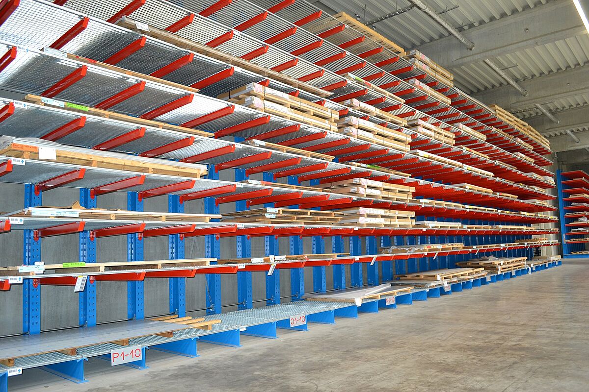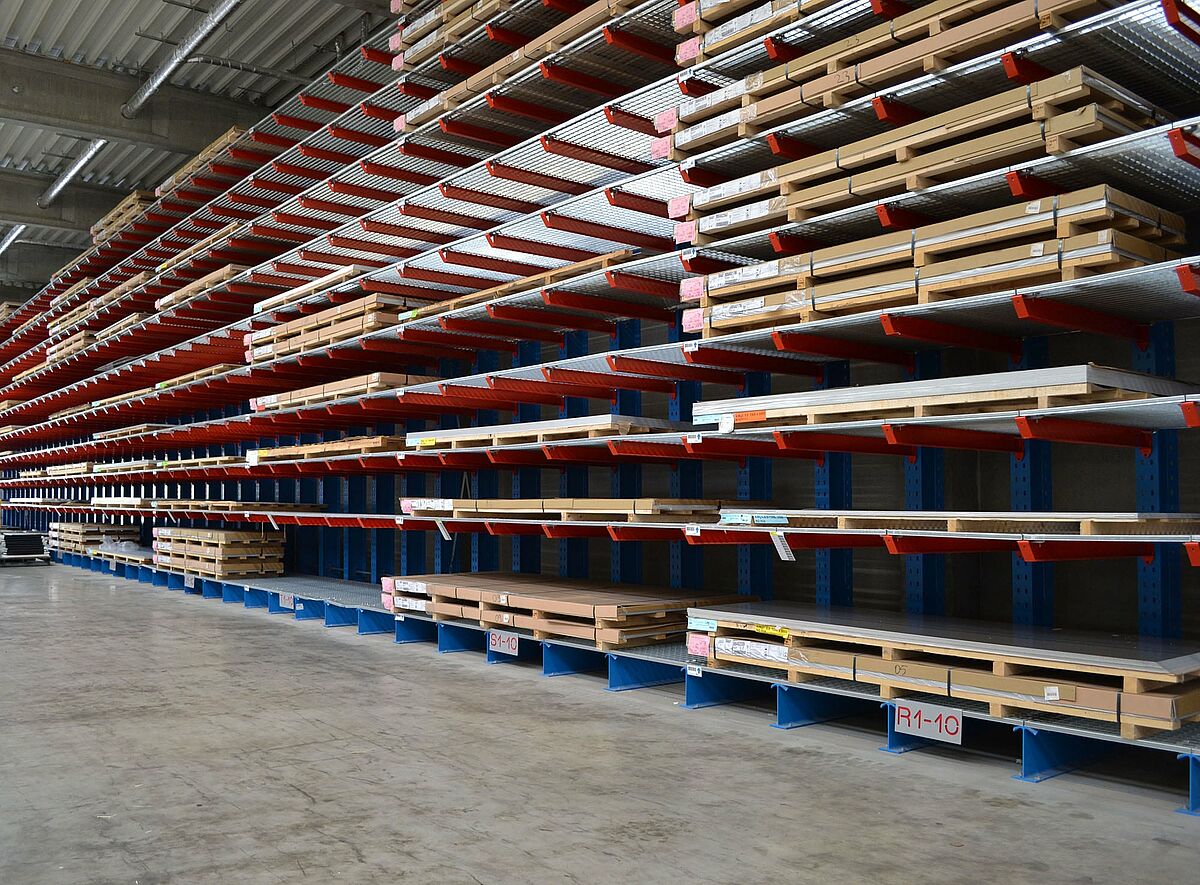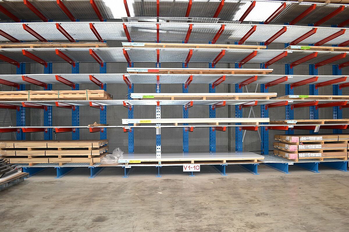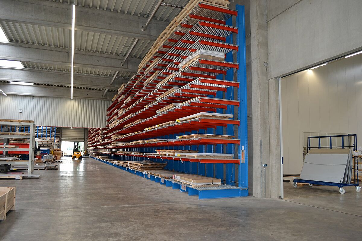 In der neuen Produktionsstätte der Ronge Profil GmbH in Alfeld bei Hannover werden die für die Produktion von Metall-Fassadenelementen notwendigen 300 bis 400 Tonnen Blech in Kragarmregale von OHRA bevorratet. Mit ihren hohen Traglasten und einer Ständerhöhe von 7.270 Millimetern bieten die Regale eine deutlich höhere Lagerkapazität, als das im alten Standort eingesetzte Regalsystem. Gitterroste auf den Kragarmen ermöglichen dabei die flexible Einlagerung unterschiedlichster Blechformate und Ladungsträger. Zudem konnte Ronge Profil mit dem Lagersystem die Kosten für die Ein- und Auslagerung der Bleche reduzieren.