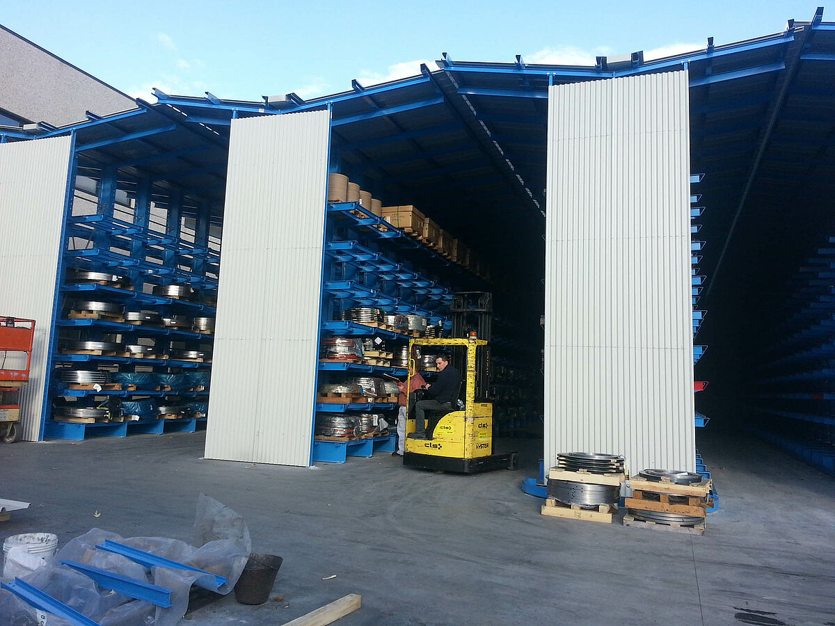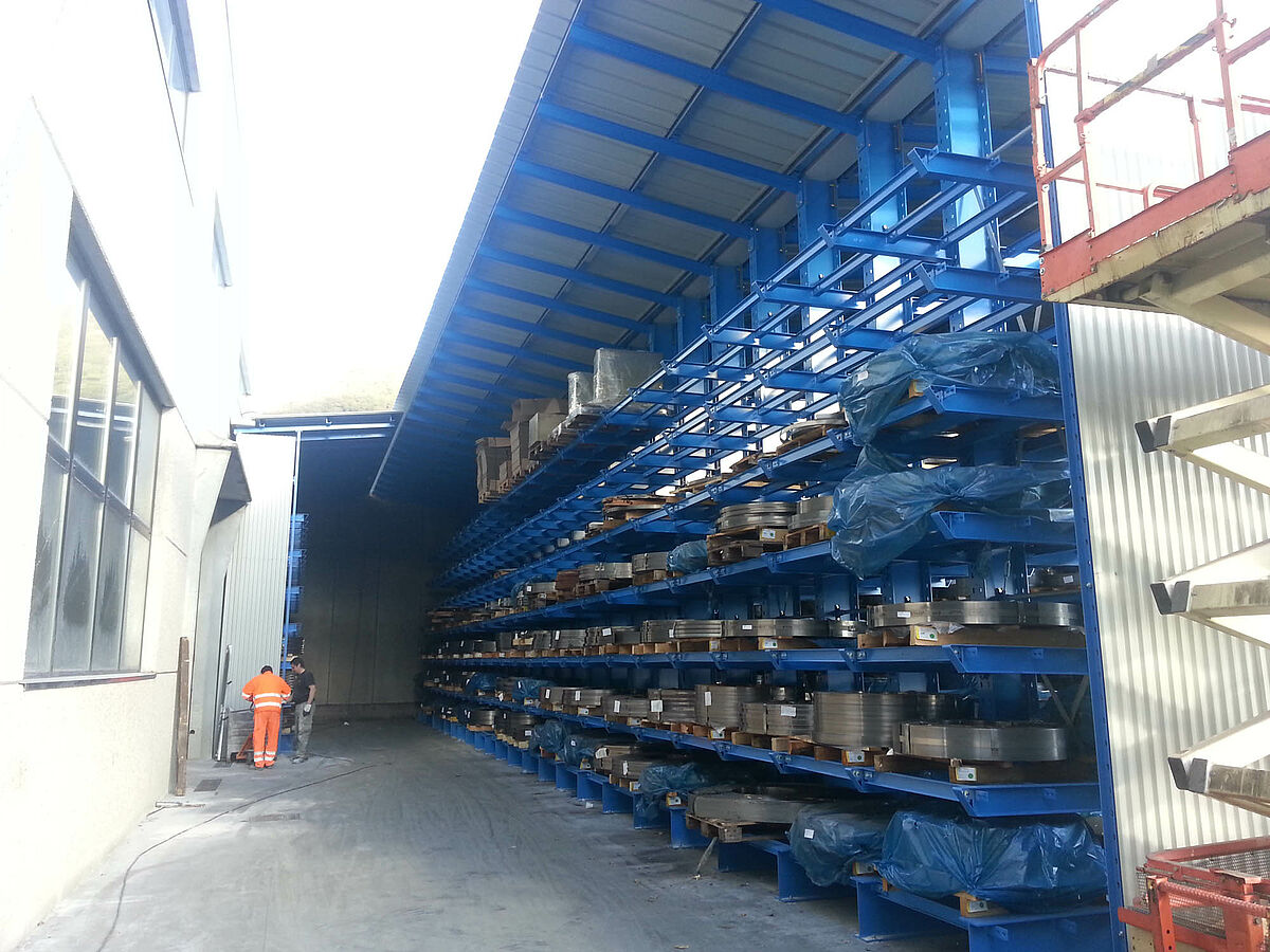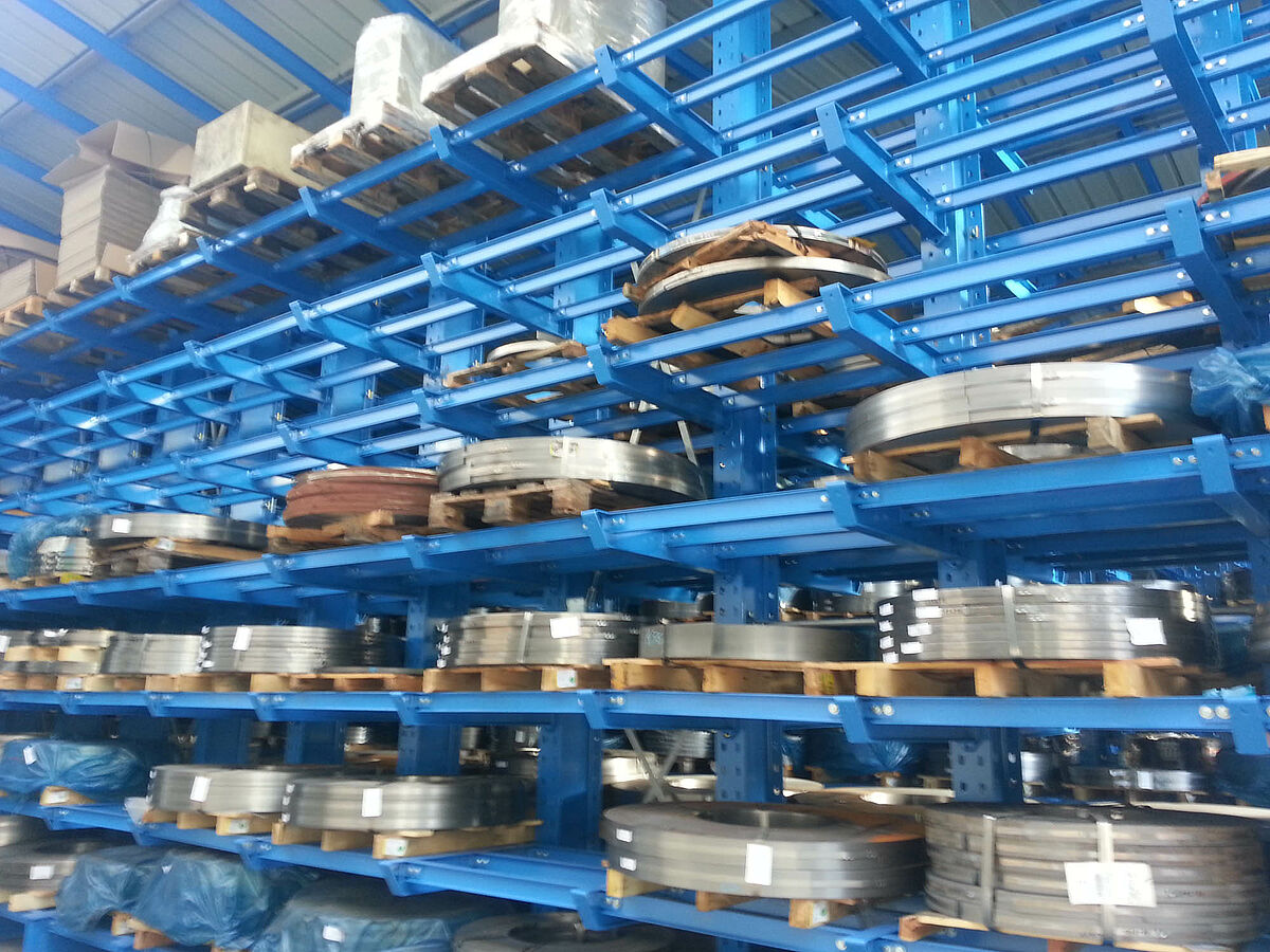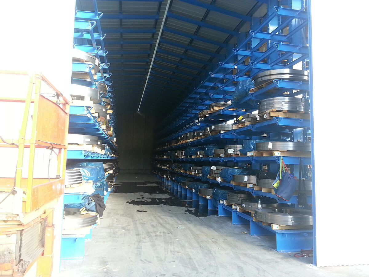 In den ersten drei Regalzeilen wird das 6.500 Millimeter lange und 4.000 Kilogramm schwere, gebündelte Stangenmaterial doppelttief auf neun Ebenen gelagert. Die Kragarme der Regale sind eingehängt und lassen sich über Schrauben millimetergenau ausrichten – so ist eine gleichmäßige Auflage des Lagerguts gewährleistet. Bedient werden diese Gassen über einen Vierwegestapler, der über an den Ständern angebrachte Schienen geführt wird. Die restlichen Regalzeilen sind mit Armbrücken ausgestattet und bieten so auf sieben Ebenen eine durchgehende Lagerfläche. Hier werden die bis zu 1.200 Kilogramm schweren palettierten Blechbänder gelagert. Bedient werden diese Gassen von einem Gabelstapler.