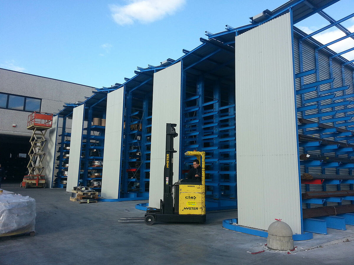 Rosa Catene produziert am Standort Caloziocorte Ketten für Anwendungen in der Landwirtschaft, in Industrie und im Gewerbe. Das kontinuierliche Wachstum des Unternehmens erforderte den Bau eines neuen Rohmateriallagers für palettierte Blechbänder und gebündelte Stahlstäbe. Den Auftrag zum Bau des Lagers bekam OHRA: Der in Kerpen, Deutschland, ansässige Spezialist für Kragarmregalsysteme überzeugte Rosa Catene mit einem Konzept, bei dem die Ständer der Kragarm-Regale gleichzeitig als tragende Konstruktion für die Halle dienen. Bei dem vorgeschlagenen Konzept überlappen sich die Dachelemente der sechs Regalzeilen gegenseitig. So entsteht ein vollständig überdachtes, modulares Lager, das zukünftig problemlos erweitert werden kann. Zudem bietet diese Konstruktion deutliche Kostenvorteile und ist schneller errichtet als eine herkömmliche Halle.