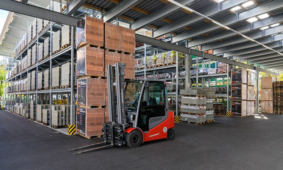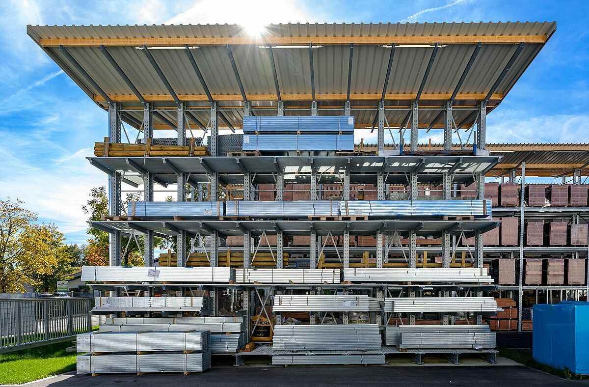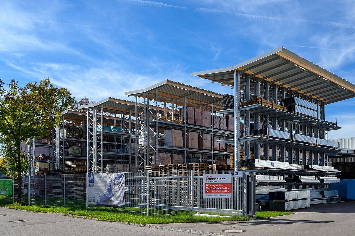 Die Regale in der Halle wie auch im Außenbereich zeichnen sich durch ihre hohen Traglasten aus: Die 1.250 Millimeter langen Kragarme können mit bis zu 1,2 Tonnen belastet werden, die Fachlasten der Palettenregale betragen bis zu 4,5 Tonnen. Um die Vielfalt der vom Baucentrum Schneider geführten Artikel flexibel lagern zu können, hat OHRA die Regale mit Gitterrosten ausgestattet – so kann vom Zementsack bis zur Euro-Palette alles an jedem Platz im Regal untergebracht werden.