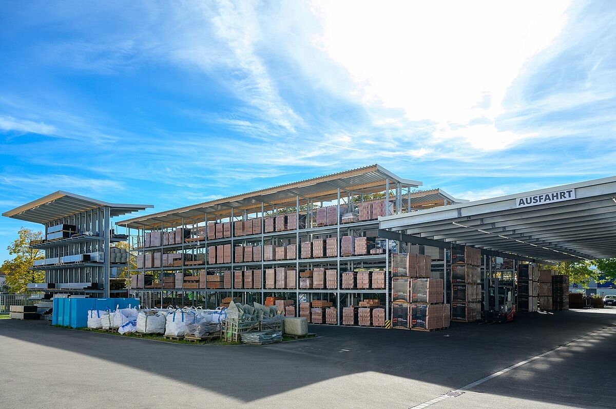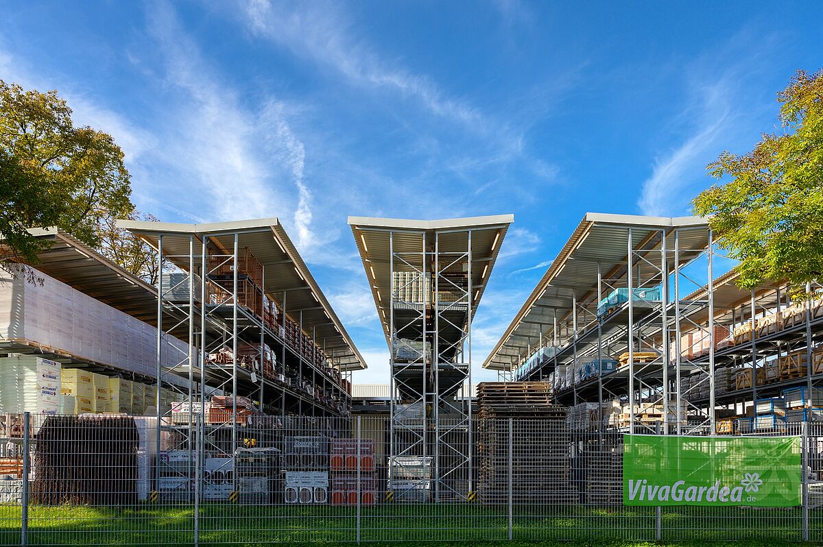 Weitere Waren finden in fünf 28 Meter langen Regalzeilen im Außenlager Platz; wie in der Regalhalle wurden hier ebenfalls Kragarm- und Palettenregale installiert. Jede Regalzeile trägt ein Dach mit einem Überstand von einem Meter. Zwischen Regalhalle und Außenlager verläuft die Fahrspur, auf der den Kunden die Ware bereitgestellt wird. Überdacht wird die Spur durch ein 13 Meter breites Dach, dass Regalhalle und Außenlager verbindet.