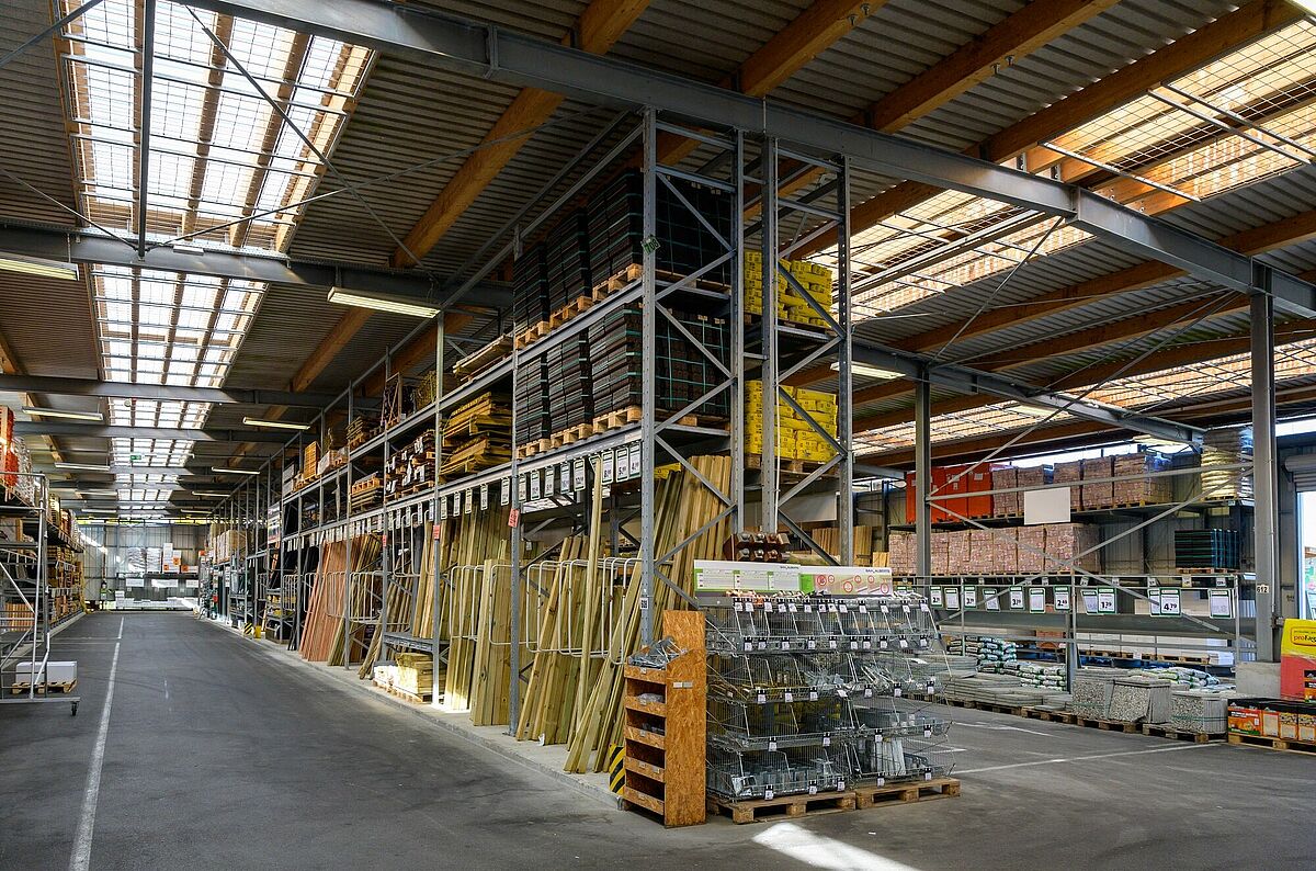Bequem mit dem Fahrzeug direkt zur gewünschten Ware fahren und einladen – gerade bei sperrigen und schweren Artikeln wie (Garten-)Baustoffen oder Gartenholz erleichtert das Drive-in-Konzept den Einkauf im Baumarkt. Auch im Fachhandel setzt Schneider auf diese Vorgehensweise. Die Kunden bekommen bei jedem Wetter Ihre benötigten Waren unter der dreispurigen überdachten Ladefläche bequem bereitgestellt. Die Halle wurde von OHRA als Regalhalle ausgeführt: Dabei dienen die Regalstützen gleichzeitig als tragende Unterkonstruktion für den Hallenbau. Das verkürzt die Projektzeit und bietet erhebliche Kostenvorteile. Ergänzt wird die Regalhalle durch Kragarm- und Palettenregale im Außenbereich, bei denen die Ware durch ein integriertes Dach vor der Witterung geschützt ist. Verbunden werden beide Bereiche durch ein 13 Meter überspannendes Dach. Zudem realisierte OHRA eine frostfreie Warmhalle, in der neben einem Bürobereich Bauchemie sowie Bodenbeläge sicher lagern.