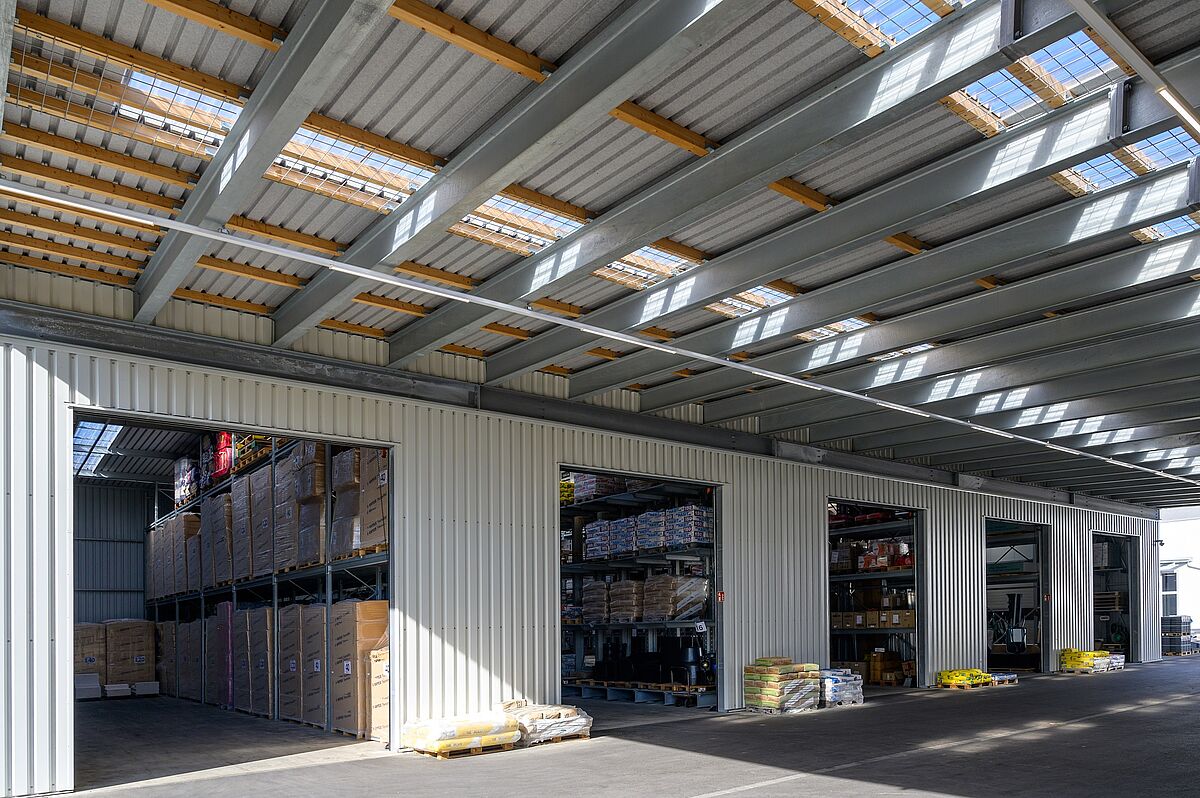 2013 wurde bereits die erste Regalhalle auf dem hagebaumarkt Gelände von OHRA als Drive-In Halle errichtet. Um den steigenden Kundenzahlen (Privat- und Fachhandelskunden) gerecht zu werden und ein noch größeres Sortiment an Fachhandels Artikeln für den Profi lagern zu können, entschied sich das Unternehmen, eine zweite Regalhalle in ähnlicher Bauweise zu errichten. Die rund 43 Meter lange und 21 Meter breite Halle wurde auf Basis von sechs Regalzeilen aufgebaut. Deren acht Meter hohe Ständer tragen die Dachkonstruktion wie auch die Außenwände. Die Warmhalle führte OHRA als Anbau mit gedämmten, 60 Millimeter dicken Dach- und Wandelementen aus.
