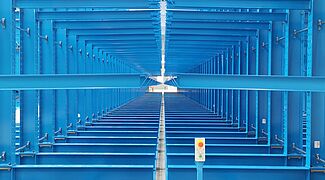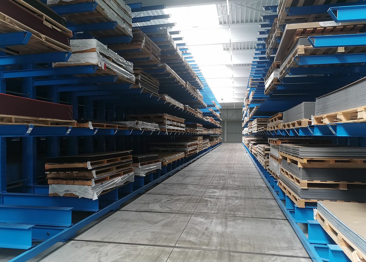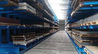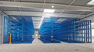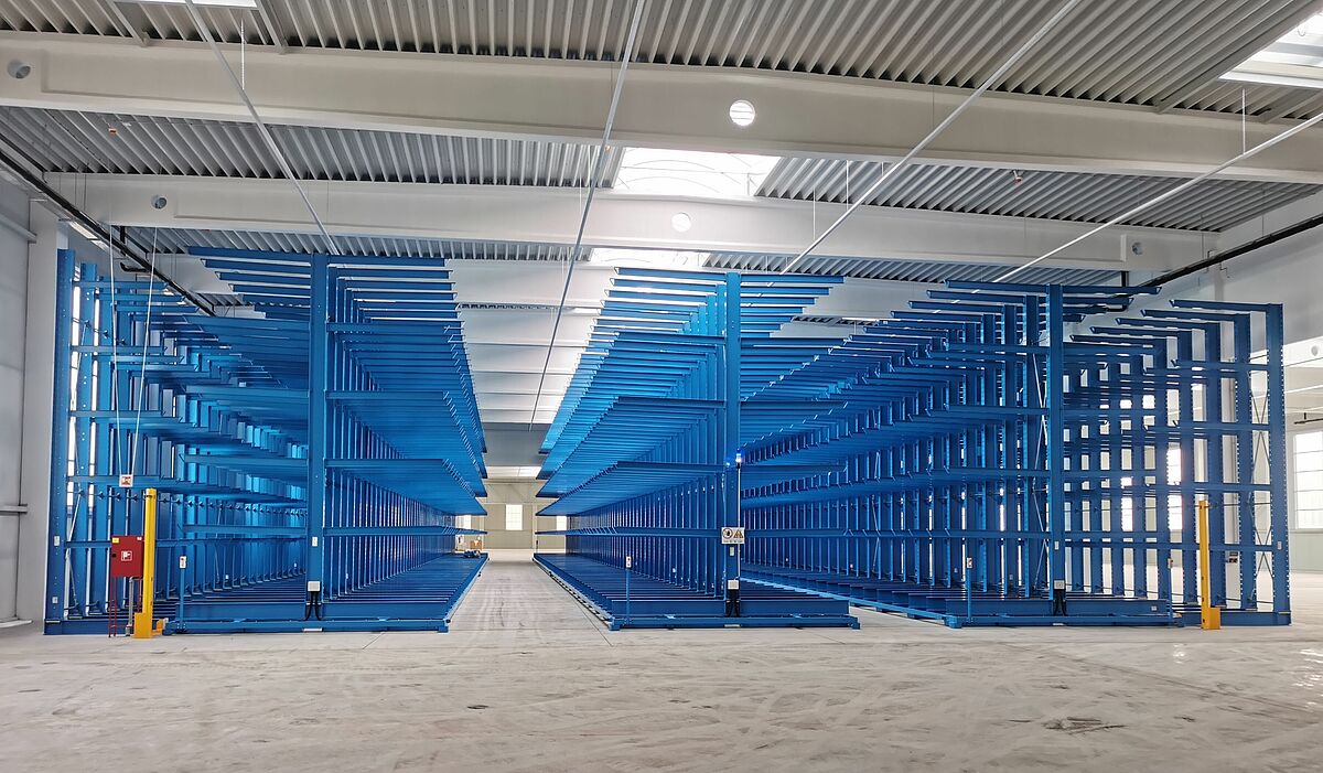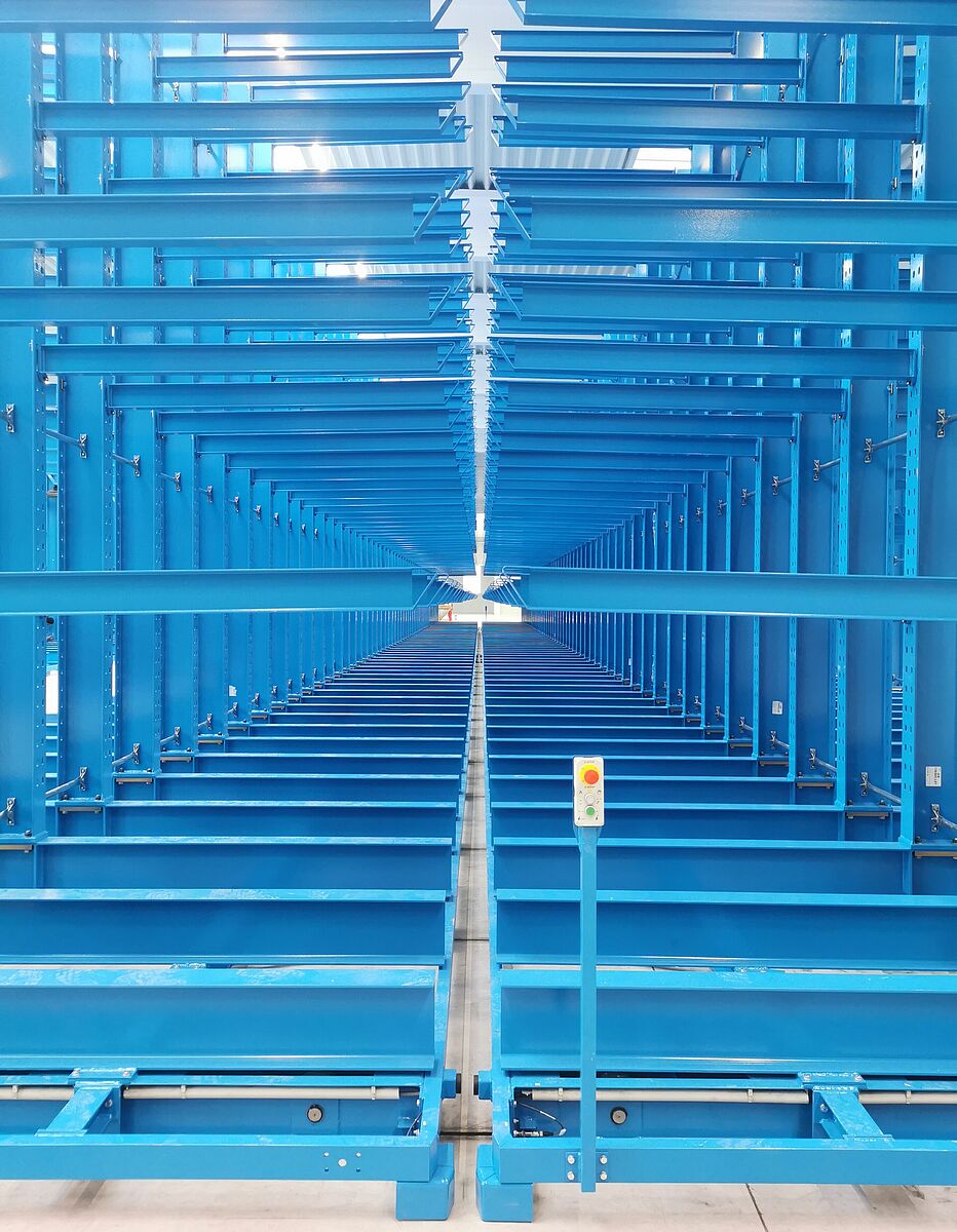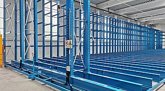 Sie besteht aus drei fest am Boden fixierten einseitigen Kragarmregalen sowie drei auf Verfahrwagen montierten doppelseitigen Regalen. Durch das Verschieben der Wagen zu einem kompakten Lagerblock ist immer nur ein Regalgang für die Bedienung mit einem Vierwegestapler geöffnet – so ist die Platzausnutzung sehr hoch. Die verfahrbaren Regale sind dabei jeweils knapp 50 Meter lang und 6,5 Meter hoch. 2,1 Meter lange Kragarme bilden fünf Lagerebenen und tragen jeweils eine Last von bis zu 800 Kilogramm. In der Summe wird jedes Fahrgestell so mit bis zu 528 Tonnen belastet. Trotz dieser Last bewegen sich die Verfahrwagen mit einer Geschwindigkeit von rund 4 Metern pro Minute – so muss nicht lange gewartet werden, bis sich der 4,59 Meter breite Bedienungsgang geöffnet hat.